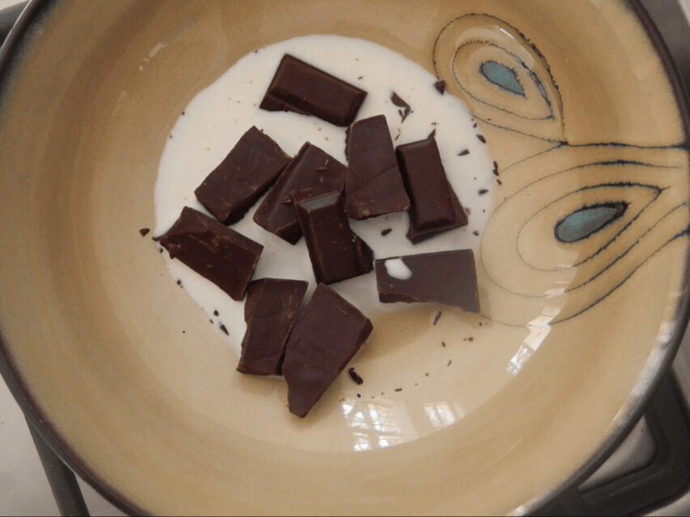 - Fill a sauce pan about ¾ of the way to the top with boiling water and put it on the stove on low heat. Place a medium sized bowl over the lid of the sauce pan and add the chocolate and 2 tbsp of milk. Once the chocolate is mostly molten, but not completely molten, remove the bowl from heat. In another saucepan, boil the 2 and ½ cups of milk.