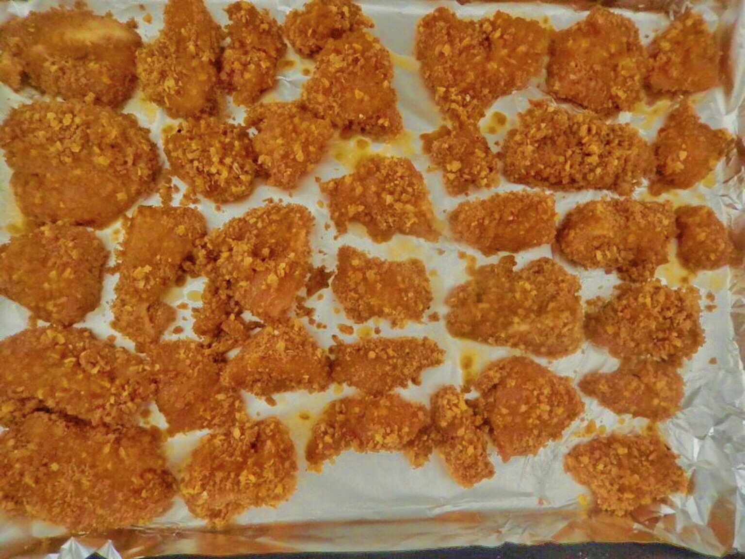 - Remove a piece of chicken from the marinade and press into the breadcrumb/cornflake mixture, making sure that the entire chicken piece is coated in the mixture. Place in the roasting pan. Repeat until all the chicken pieces are coated.