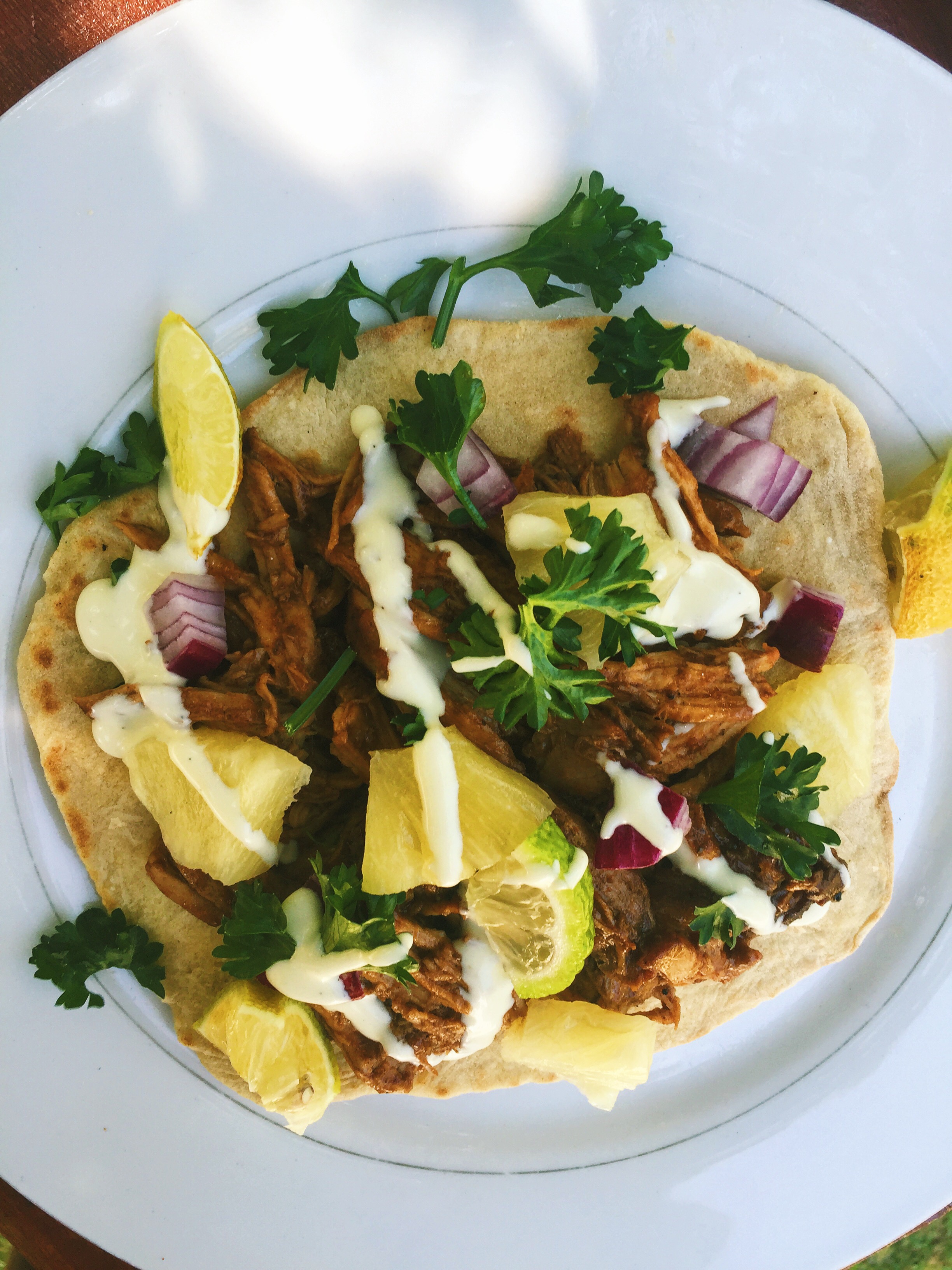- Place a tortilla on a plate. Cover the tortilla with the pulled pork, leaving a border that’s about ½ inch wide. Top with red onion, pineapple, lime wedges, parsley and finally sour cream. Serve and enjoy!