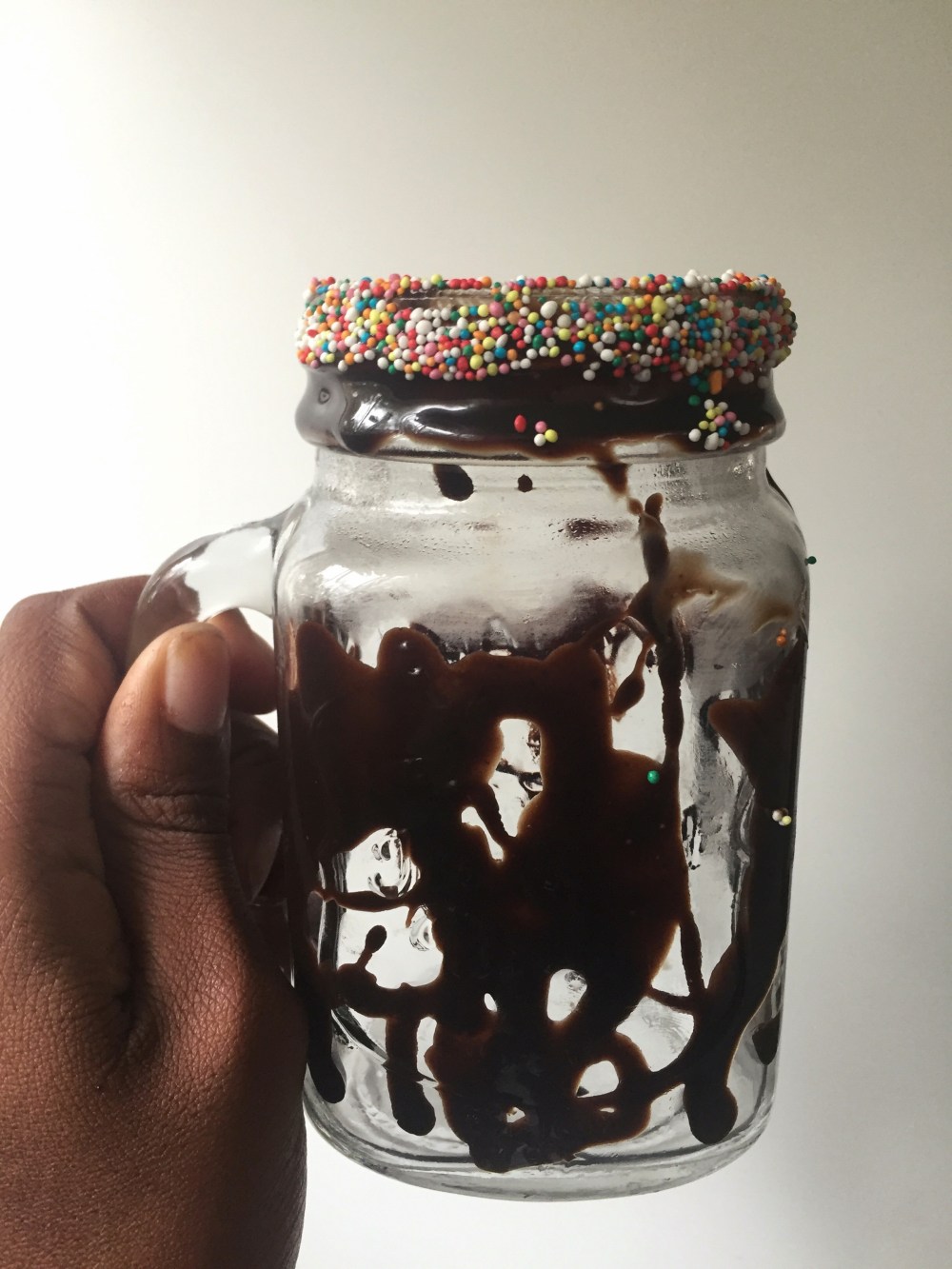 I started with this Homemade Hot Fudge Sauce by Brown Eyed Baker. It is PHENOMENAL. I’ve made it like 3 times now, and I swear to you that this stuff is like liquid gold. I use it on everything from pancakes to ice cream, and most recently, these milkshakes. I started by sticking the milkshake jugs in the freezer for about an hour (this is purely optional but is highly recommended in order to keep the milkshakes cold) before lining the lip of the jugs with the hot fudge sauce and then rolling it in sprinkles. I then dipped a spoon in the sauce and decorated the inside of the glasses with the sauce. I then placed the glasses back in the freezer before proceeding to make the milkshakes. These steps are minimal but make a huge difference as far as presentation is concerned, and I can guarantee that whoever you are serving will be wildly impressed.