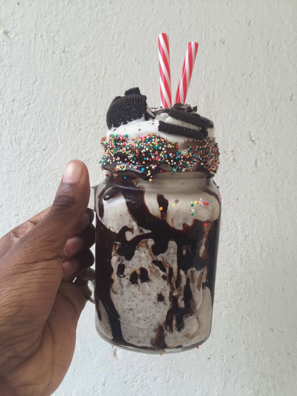 - Remove the glasses fro, the freezer (again) and pour the milkshake until it reaches the brim of the cup. Garnish generously with whipped cream, crushed Oreos, hot fudge sauce and of course, more sprinkles! Add a straw and enjoy!