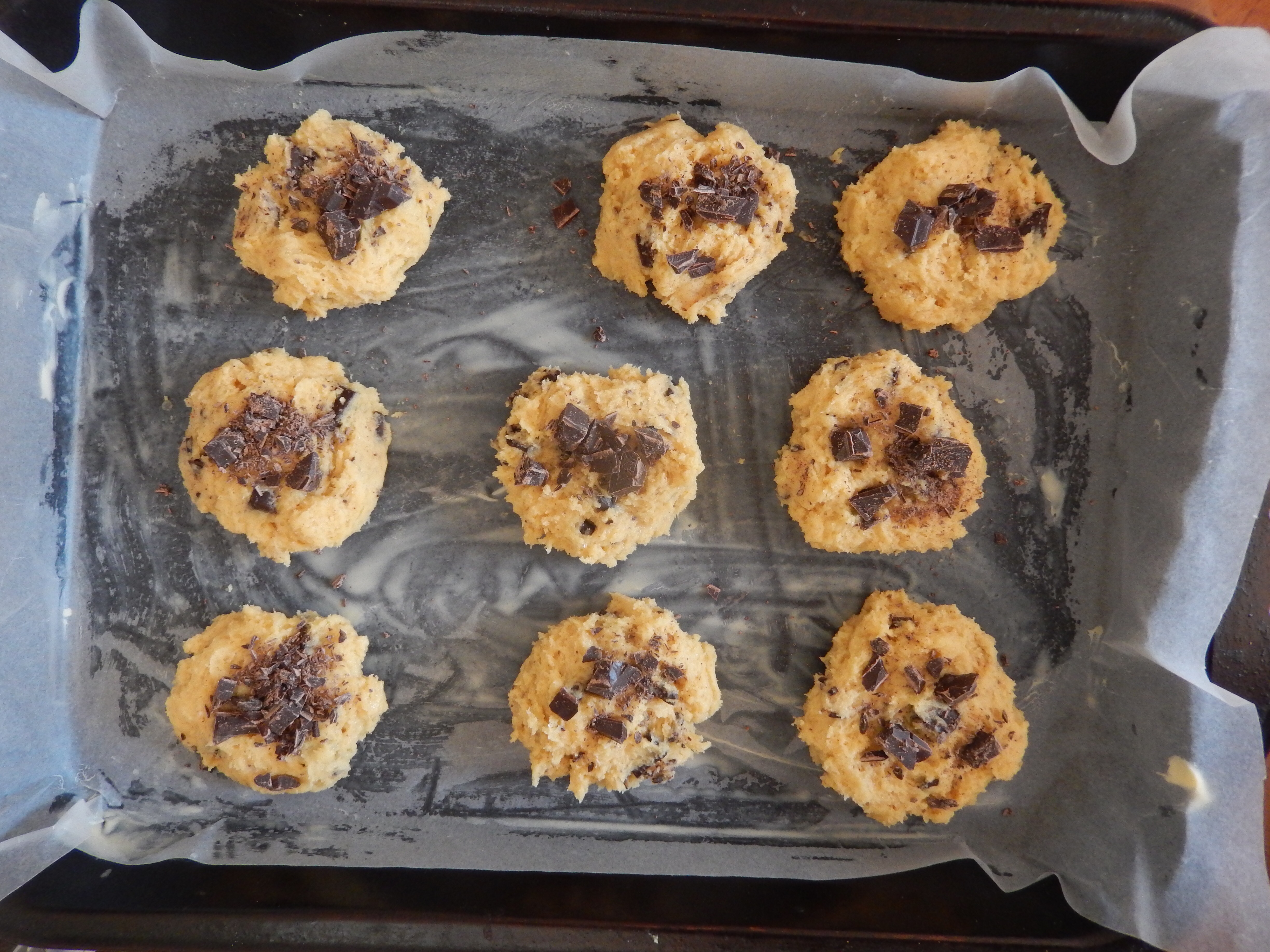 - Using a cookie scoop/ice cream scoop/tablespoon, shape the dough into cookies and spoon them into the baking sheet. I used about 2 tablespoons of dough per cookie*Leave about 2 cm of space between each cookie. After you’ve scooped all the dough and formed cookies, sprinkle the last ¼ cup of chocolate pieces over the cookies. **Refrigerate for 24 hours. This step is optional but vital in order to obtain that intense butterscotch flavour.