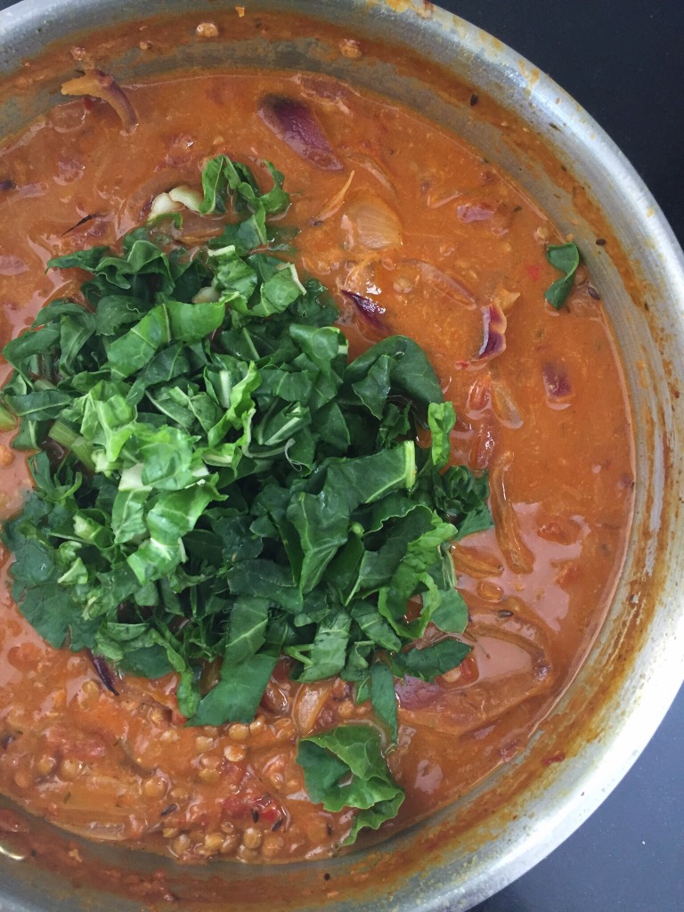 Heat a tablespoon of olive oil in a deep saucepan and toast the cumin seeds for a minute before adding both the yellow and red onion. Fry the onions until translucent then add the red curry paste. Coat the onion in the paste and cook for another 2 minutes before adding the tinned tomatoes and coconut milk. Season with salt and pepper. Bring to a boil before adding the dried lentils and 2 cups of water. Reduce the heat to low and simmer for 30 minutes.