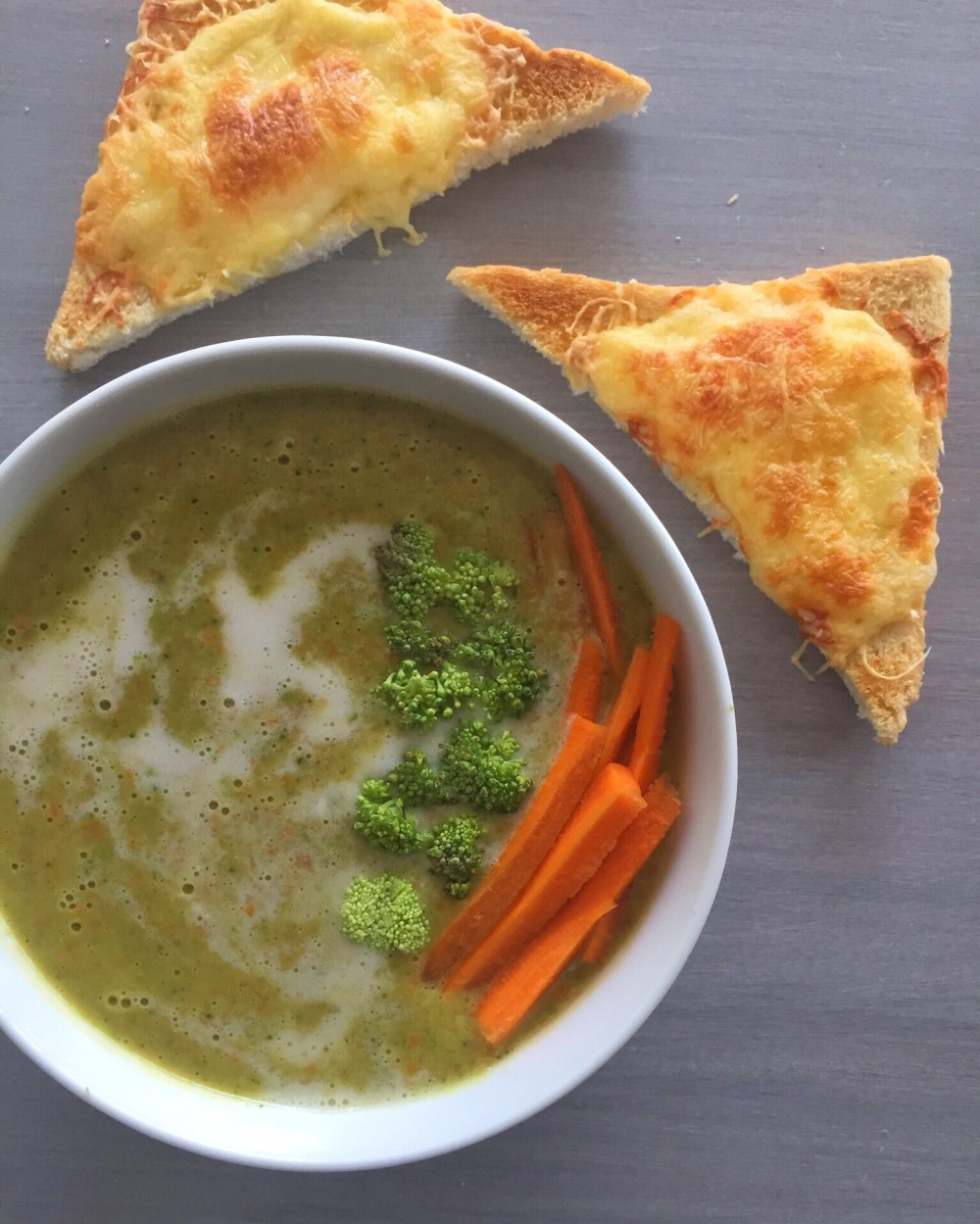 Minty Peas and Broccoli Soup with Cheese Toasties serves 4
