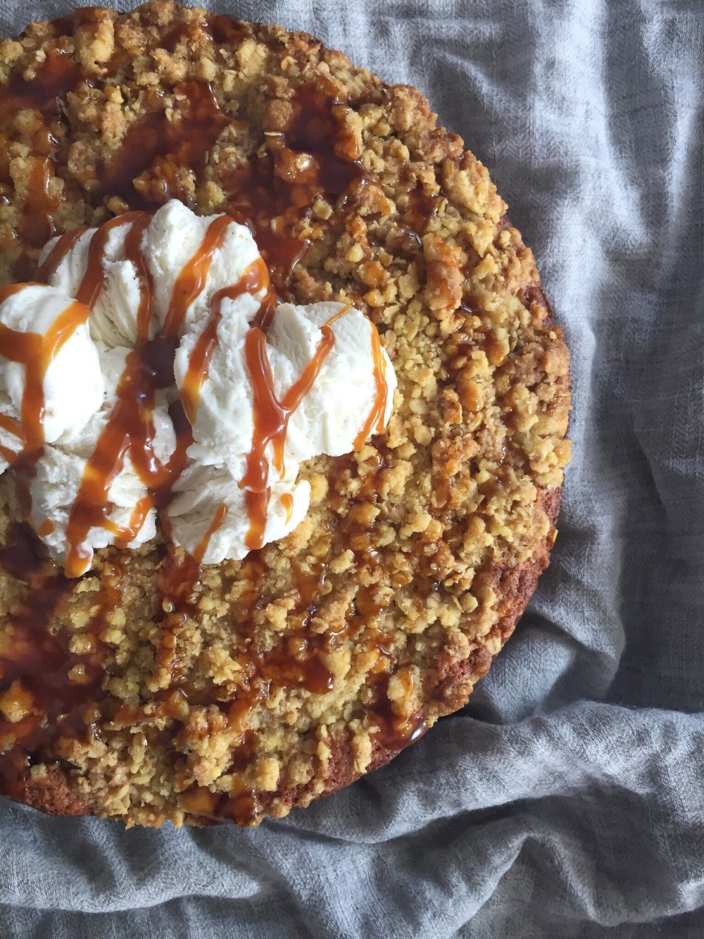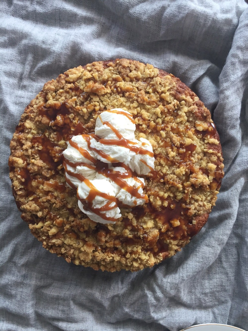 The answer: NOTHING. This cake combines all my favourite things into a glorious slice of heaven. It is absolutely beautiful, moist, filling and the crumble just takes it that extra mile. I’ve been in love with this cake since I made a variation of it 2 months ago with bananas. It had all the same themes here, crumbly streusel topping, smooth vanilla ice cream and a gorgeous caramel drizzle to seal the deal. I’d been meaning to make that cake again but unfortunately bananas are out of season! With this unforeseen obstacle ahead, I decided to use apples instead and the result was just as gorgeous.