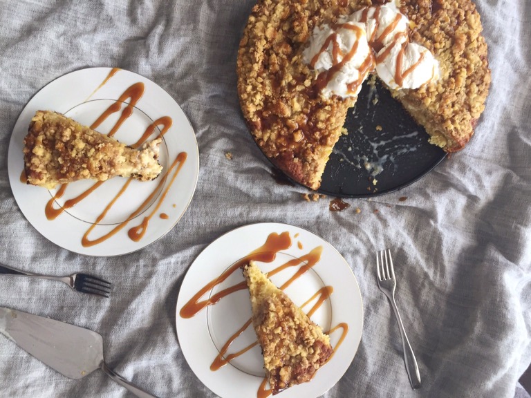 - Sprinkle the streusel over the cake batter in an even layer. Bake the cake for 35-40 minutes in the preheated oven, the cake is done when the streusel is a deep golden brown and a toothpick comes out clean. Let cool at room temperature for at least 15 minutes before serving. This is best served warm with caramel sauce and ice cream. Lush!