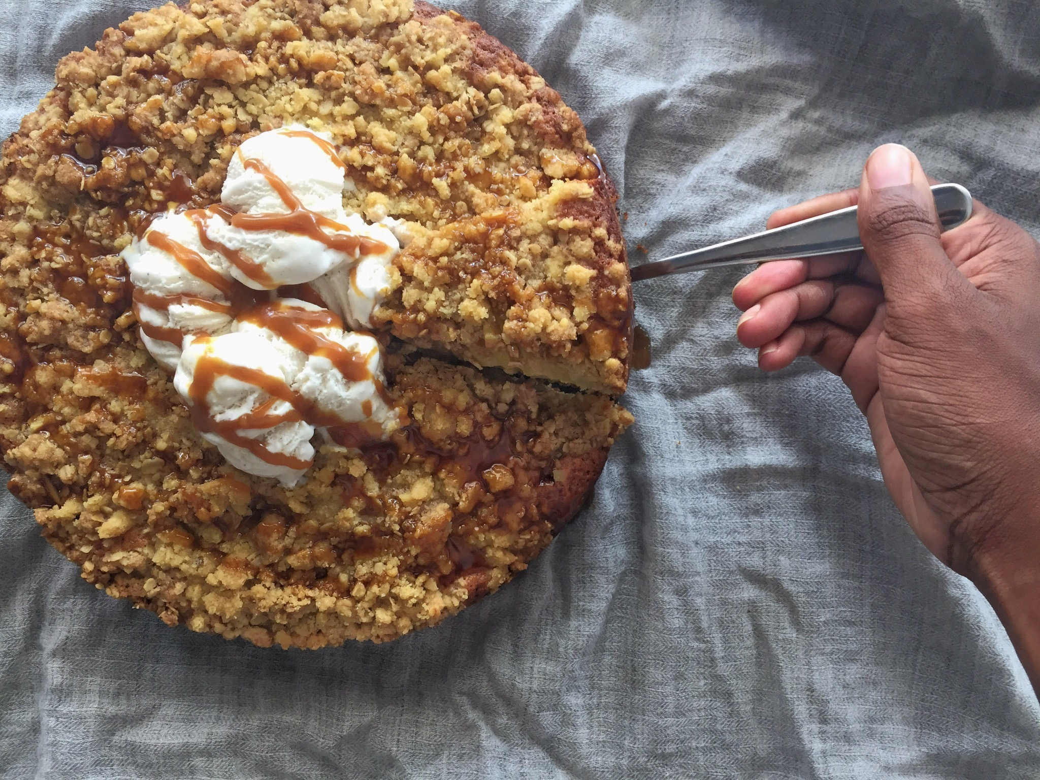 The answer: NOTHING. This cake combines all my favourite things into a glorious slice of heaven. It is absolutely beautiful, moist, filling and the crumble just takes it that extra mile. I’ve been in love with this cake since I made a variation of it 2 months ago with bananas. It had all the same themes here, crumbly streusel topping, smooth vanilla ice cream and a gorgeous caramel drizzle to seal the deal. I’d been meaning to make that cake again but unfortunately bananas are out of season! With this unforeseen obstacle ahead, I decided to use apples instead and the result was just as gorgeous.
