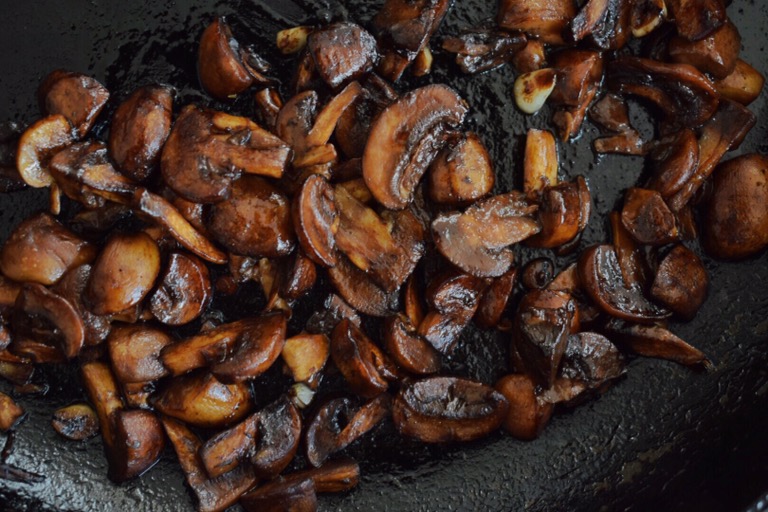 - Coat the bottom of a frying pan with olive oil on high heat and fry the mushrooms and garlic until the mushrooms are dark brown and have softened, about 5 minutes. Pour in the balsamic vinegar and reduce the heat to low. Cook, stirring frequently until the balsamic has reduced and most of the liquid has evaporated. Set aside.
