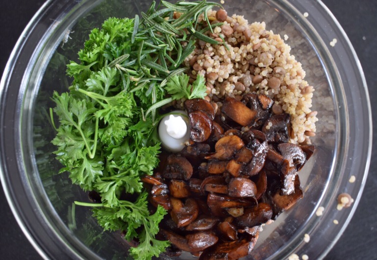 - Add the lentil quinoa mixture, mushrooms, parsley and rosemary to a food processor. Pulse until you have a thick mixture that holds together and can easily be shaped into patties. This took me about 2 minutes. If your mixture is too heavy for the food processor, then you can add 2 tbsp of water to ease it along.