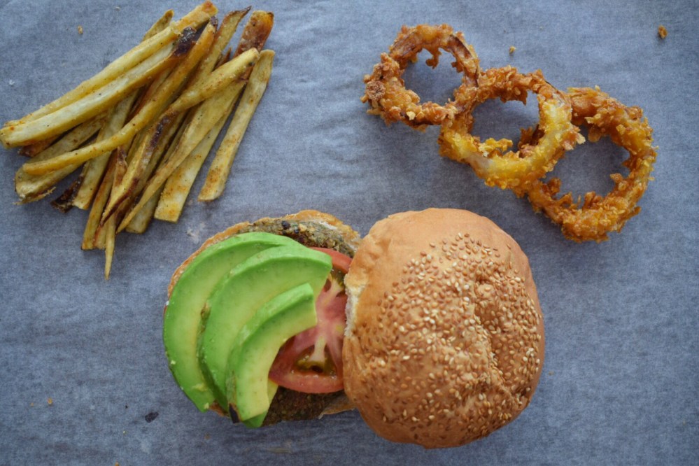 Good old Google came in handy here, by suggesting that I introduce umami rich foods into my diet, such as mushrooms, sweet potatoes and balsamic vinegar. So what did I do? I incorporated all these elements into the ultimate feel good vegan burger. Mushrooms fried and dressed in a balsamic vinegar reduction, sweet potato fries on the side and gorgeous crispy onion rings, how could one ask for more?