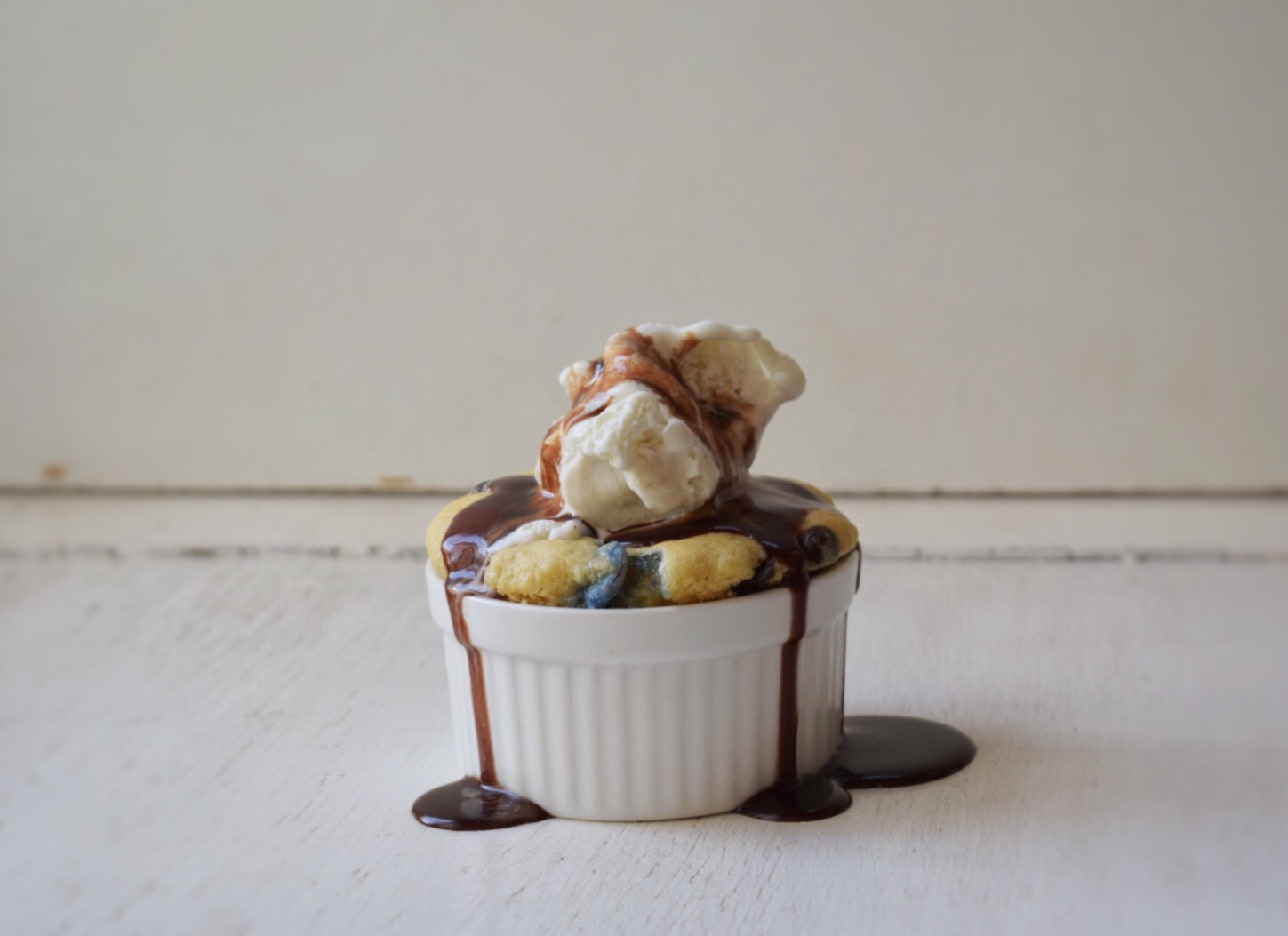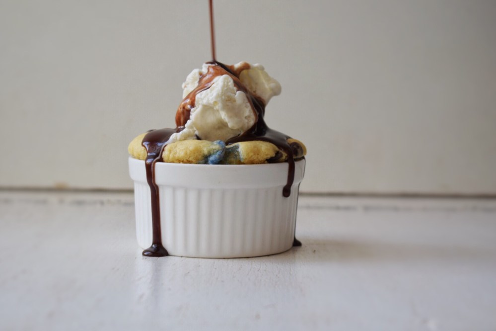 Grease 4 ramekins and preheat your oven to 200°C/400°F. Prepare your cookie dough and add to a medium bowl. Add the chocolate chips and the Smarties and use a rubber spatula to fold into the dough, making sure the candies are evenly distributed. Add ½ cup of cookie dough to each ramekin and bake 8 minutes, or until the dough has risen and is just starting to turn golden brown. Remove from the oven and let cool for 2 minutes before topping with vanilla ice cream and hot fudge sauce. Indulge immediately!