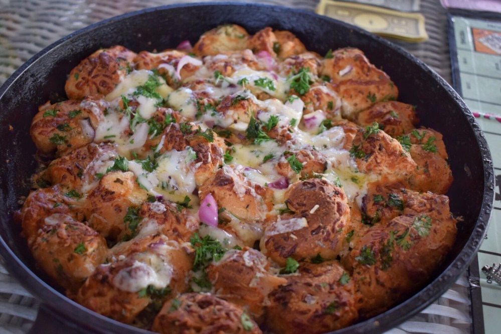 Lay the dough pieces in the bottom of the skillet in a single layer and bake 15 minutes in the preheated oven. Remove and top with the remaining cheese mixture and bake for an extra 5 minutes. Serve immediately!