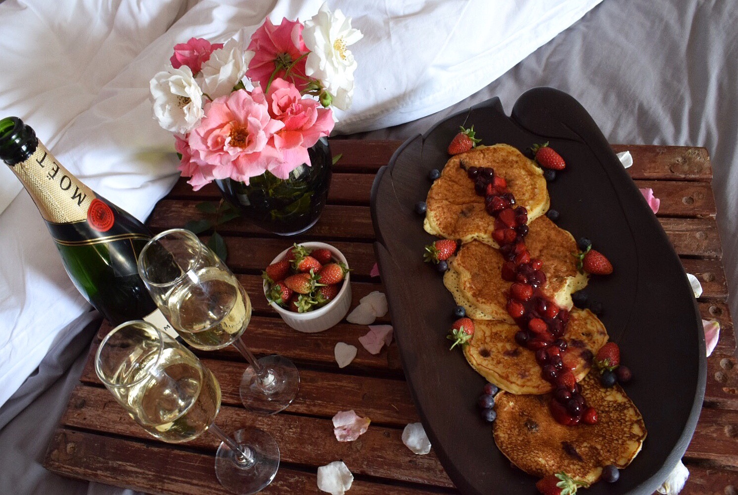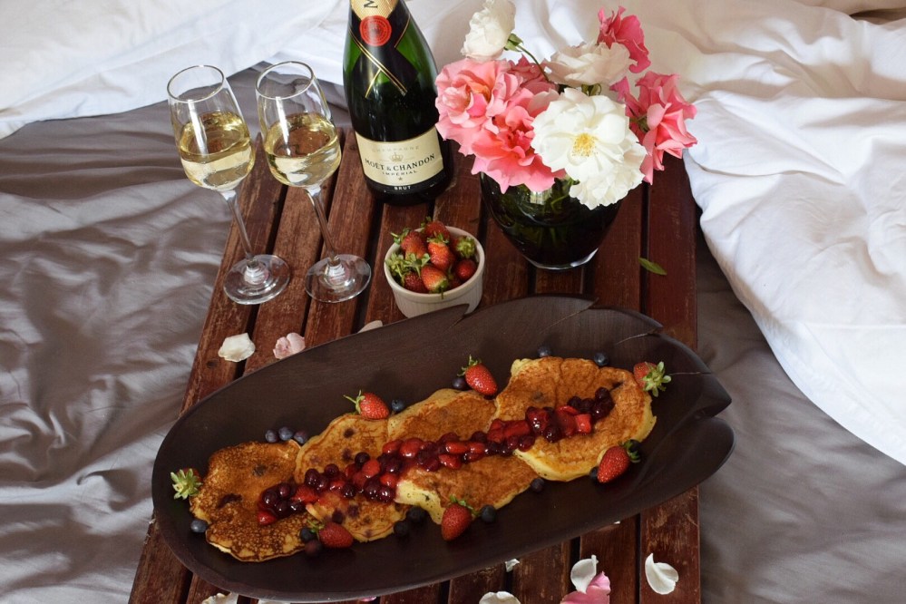 A couple of weeks ago I did a Berry Waffles Breakfast In Bed for Valentine’s Day and since then I’ve been itching to do something under the same theme. There’s just something about enjoying warm comfort food in Egyptian cotton sheets that rings all the bells for me. Lucky for me, there was half a bottle of champagne in the fridge that I could use as a prop here. Even though Valentine’s Day has passed, it doesn’t mean you can’t surprise your loved one this weekend with a romantic gesture. Today is the last day of February, but we still have many more holidays to look forward to such as Mother’s Day, Women’s Day and even looking so far as Thanksgiving! This is the perfect way to express gratitude whether it be to your parents, your lover or even your best friend!