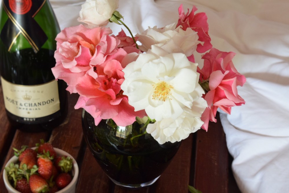 It doesn’t have to be pricey, it’s the thought that counts. I found this wooden tray amongst the other household junk that was thrown out and decided to keep it knowing that it would come in handy later. I harvested a couple of roses from the garden and set them up with a vase and water. We’ve already spoken about the champagne and I just used a ramekin of fresh strawberries and the champagne as decoration. Don’t limit your creativity lovers, inspiration is everywhere!