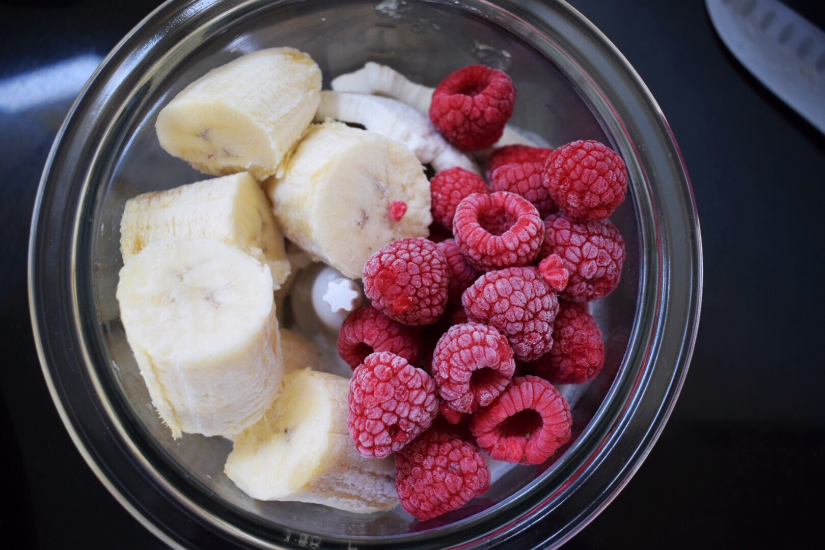 - 2 frozen bananas, peeled and chopped (Top tip: peel and chop your bananas before freezing them, a lesson I learnt on my second attempt)