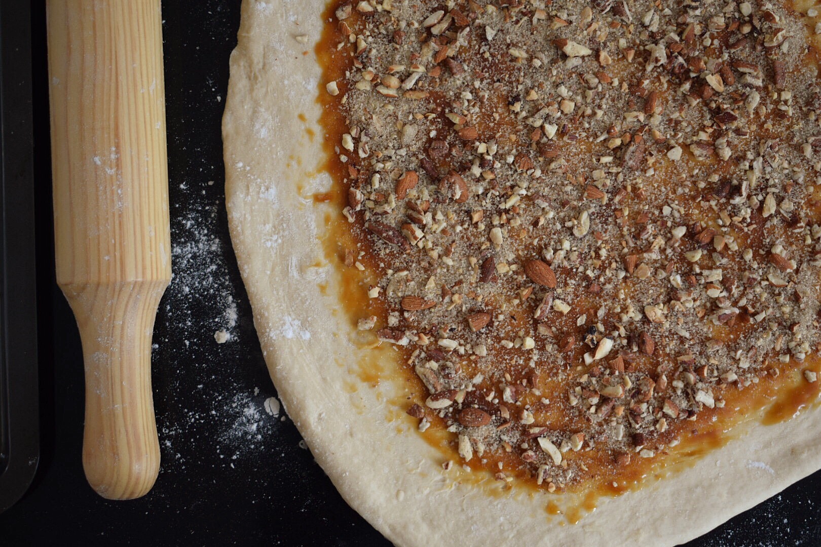 - Add the pecans and almonds to a large roasting pan and roast at 200°C/400°F for 15 minutes, or until darkened and very fragrant. Allow to cool at room temperature before crushing to small pieces using either a food processor or a meat hammer. Add to a small bowl along with the brown sugar. Reserve a ¼ cup of this mixture for topping the dough.