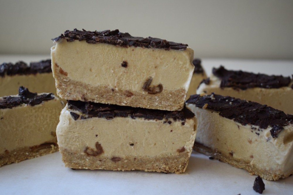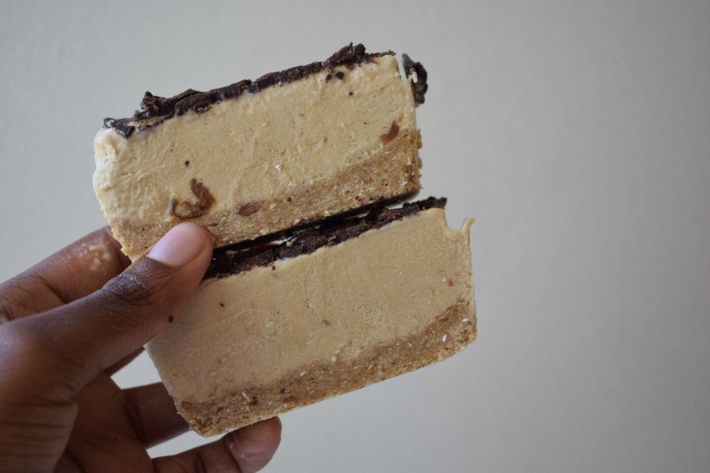 Line a loaf pan with parchment paper. Add the oats and almonds to a food processor and pulse until it forms a fine, crumbly meal. Add the dates and maple syrup and process until you get a thick, dough. Press the dough into the bottom of a loaf pan in an even layer. In the same blender, process the vegan caramel you made earlier with the cashews and maple syrup. Pour the caramel layer over the base and freeze for 4 hours, or until solid. Slice into bars, and let chill at least 5 minutes at room temperature before consuming. Enjoy!