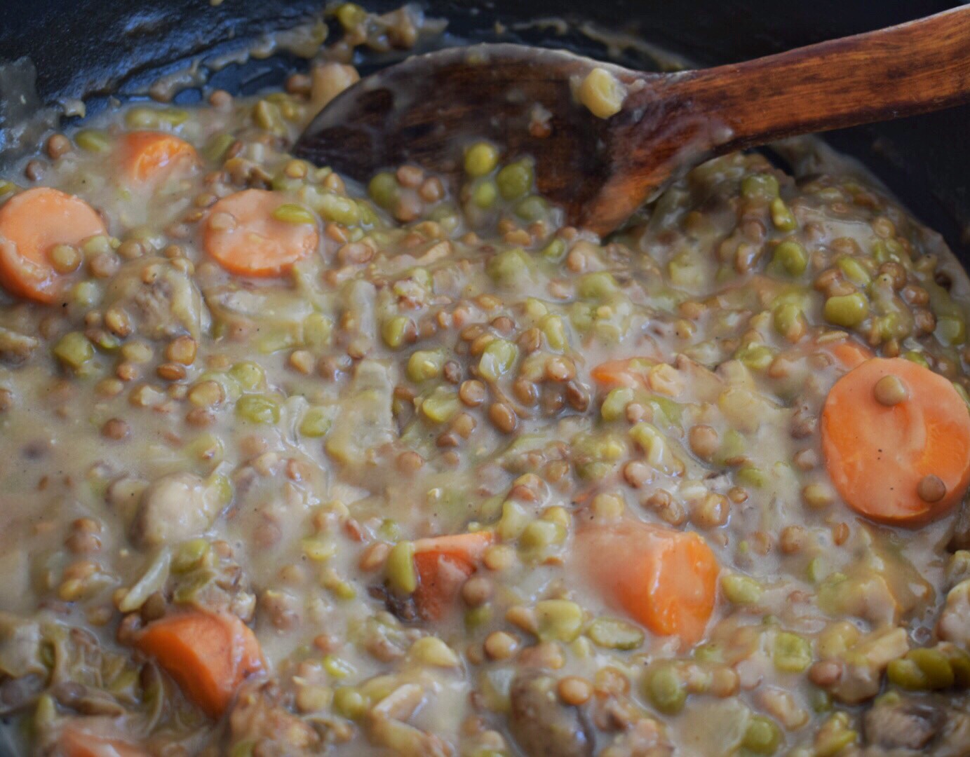 - Bring the mixture to a boil before reducing the heat to low. Simmer for 15-20 minutes or until the lentils and peas are soft and cooked through. You’re going to want to watch the pot very carefully here as the mixture will thicken considerably and will burn if left for too long. If the mixture seems very thick and the pulses haven’t cooked as yet, add a cup of water to the pot. Season with salt and pepper to taste.