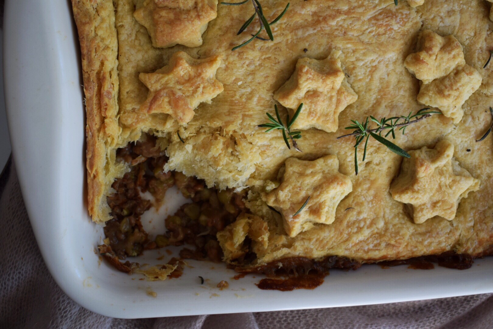 - Once the filling has cooked distribute it evenly amongst the serving plates. Cover with the remaining puff pastry. If you have scrap puff pastry, you can use a cookie cutter to cut shapes into it and use it as a topping like what I did with these stars. Bake in the preheated oven for 37-40 minutes or until the pastry is deep golden brown. Let rest for 5 minutes at room temperature before serving. Leftovers will keep sealed tightly in the fridge for up to 3 days. Enjoy!