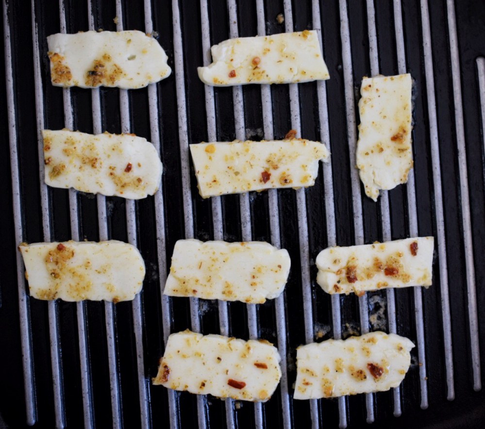 1. In a small bowl, combine the olive oil, chilli powder, garlic powder, oregano, S & P. Add the halloumi and toss until coated. Set aside for 10 minutes whilst you prepare the filling.