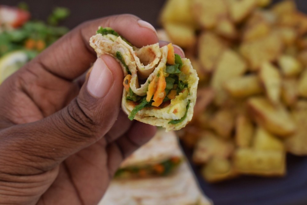 This was shot on one of those days that I just felt like cooking. I roasted some chopped potatoes with cayenne pepper, garlic powder, mixed herbs and S&P; threw together a quick strawberry basil salad and rolled up these kick-ass wraps to go with them. How’s that for a healthy balanced lunch?