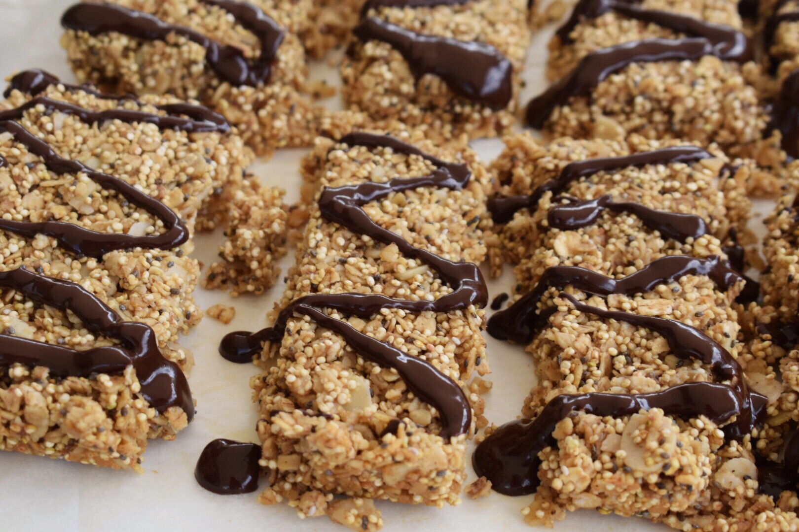 - Add the chocolate and coconut oil to a small bowl. Microwave in 20 second increments, whisking after each, until melted. Drizzle the chocolate over the sliced bars. Leave for 5 minutes to set before indulging. Enjoy!