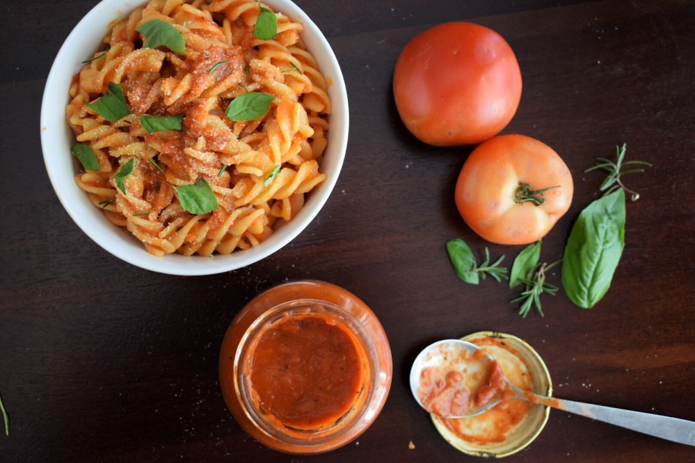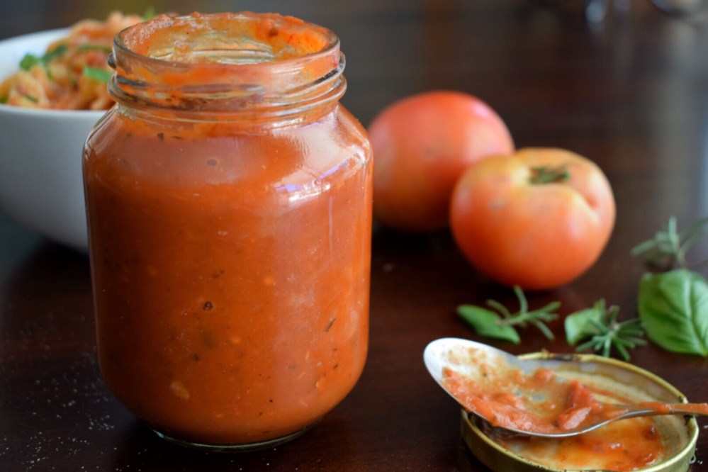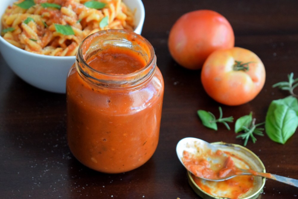 Bring the mixture to a boil then reduce the heat to low and simmer for 30-45 minutes, or until the tomatoes have cooked down released their juices. If you’d like your sauce to be chunky, then great news, you’re all done! Store in a sterilised glass jar in the fridge for up to a month. If you’d like a smooth sauce then add the contents of the pot to a blender and puree for 2 minutes or until there are no longer any large tomato pieces before adding to a glass jar for storage. Use in pastas, as a base for pizza or as a sandwich spread (as my friend recently started doing). Enjoy!