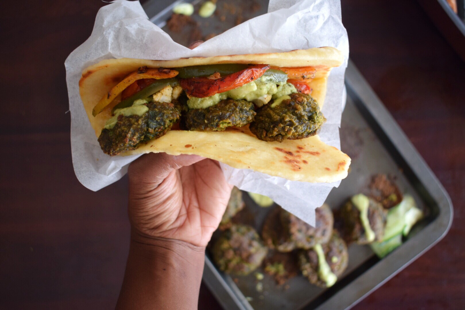 Falafels are traditionally eaten in a pita with cucumber and a yogurt sauce. Today we’re keeping it strictly vegan with an avocado sauce that I will also be posting soon. I didn’t have any pitas on hand, but there was some naan dough that I had frozen, so I whipped up a batch of fresh naan and can I just say, BEST LUNCH EVER. So I encourage you today, reader: go forth and make delicious falafel balls!
