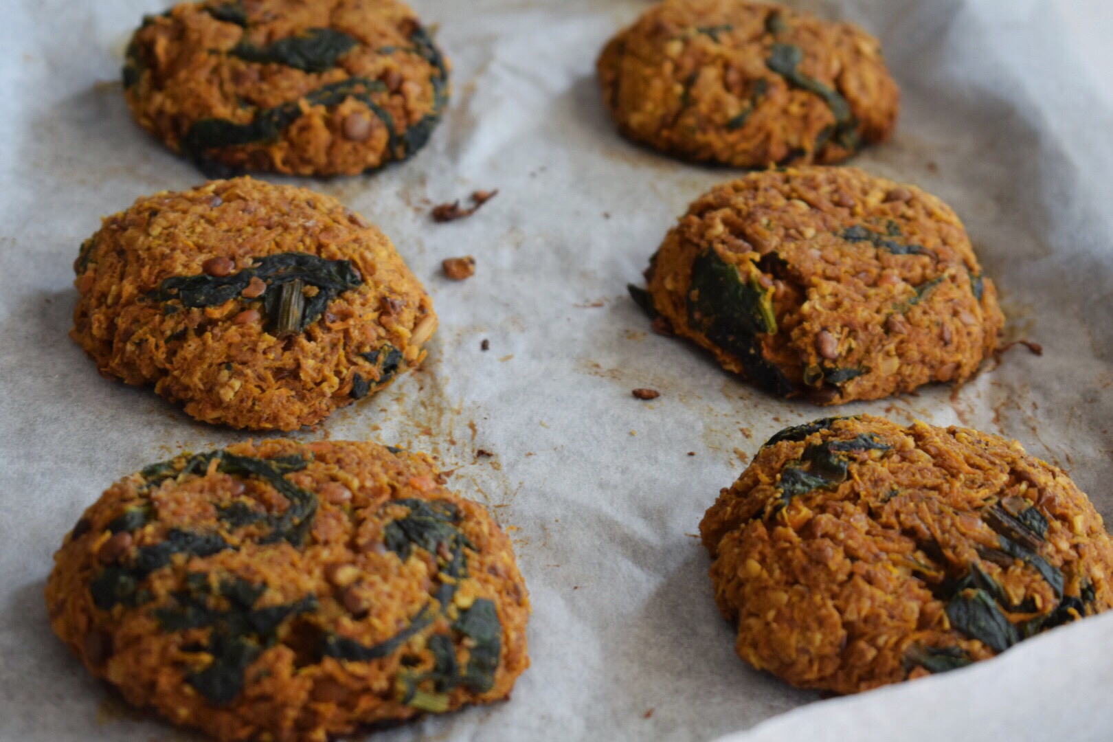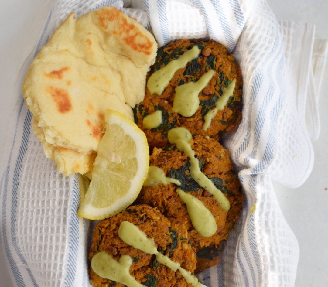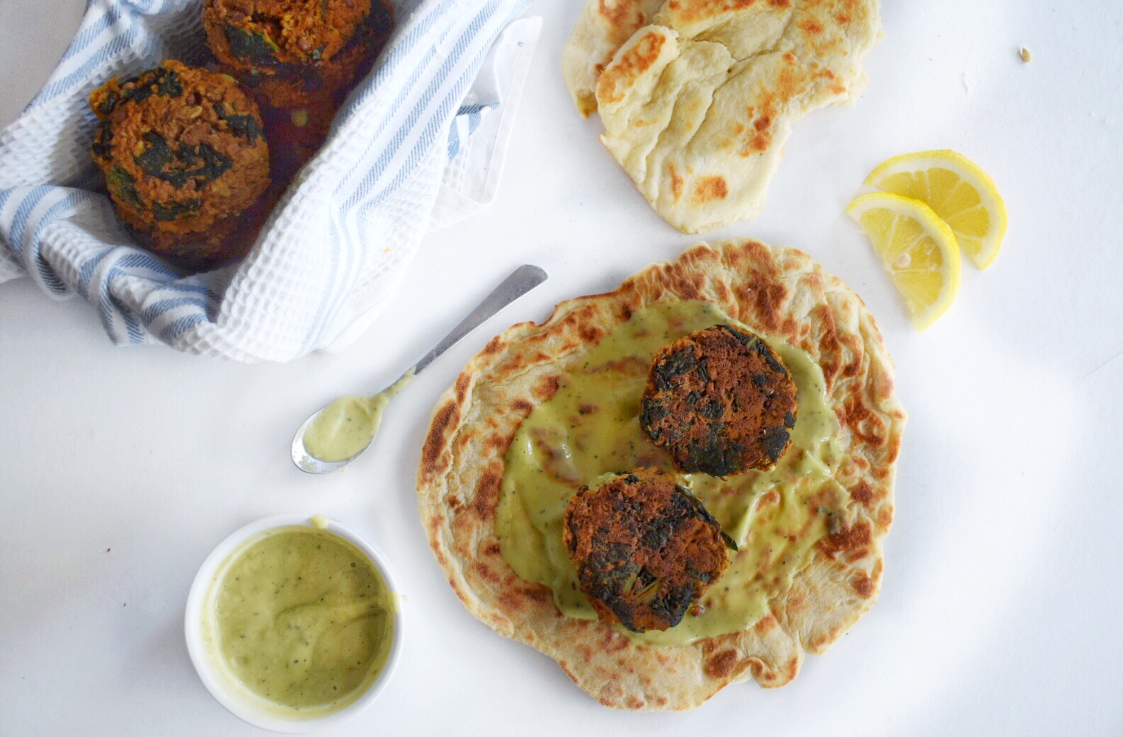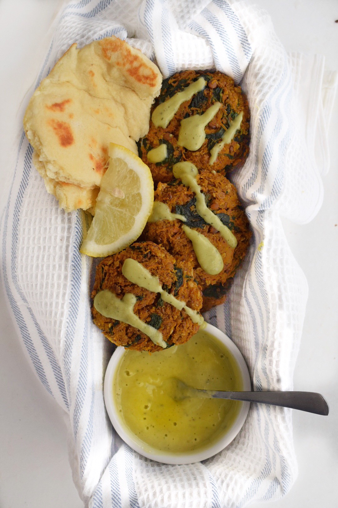 - Line a 9×13 inch pan with parchment paper/aluminium foil and preheat your oven to 180C/350F. Grab a heaping tablespoon of the carrot spinach mixture and shape into a patty with your hands. It’s much easier if your hands are damp. Add each patty to the baking sheet as you form them, making sure to leave some space in between them. Bake for 25-30 minutes or until slightly golden brown. Serve hot with the avocado dressing, some naan and extra roasted veggies. Enjoy!