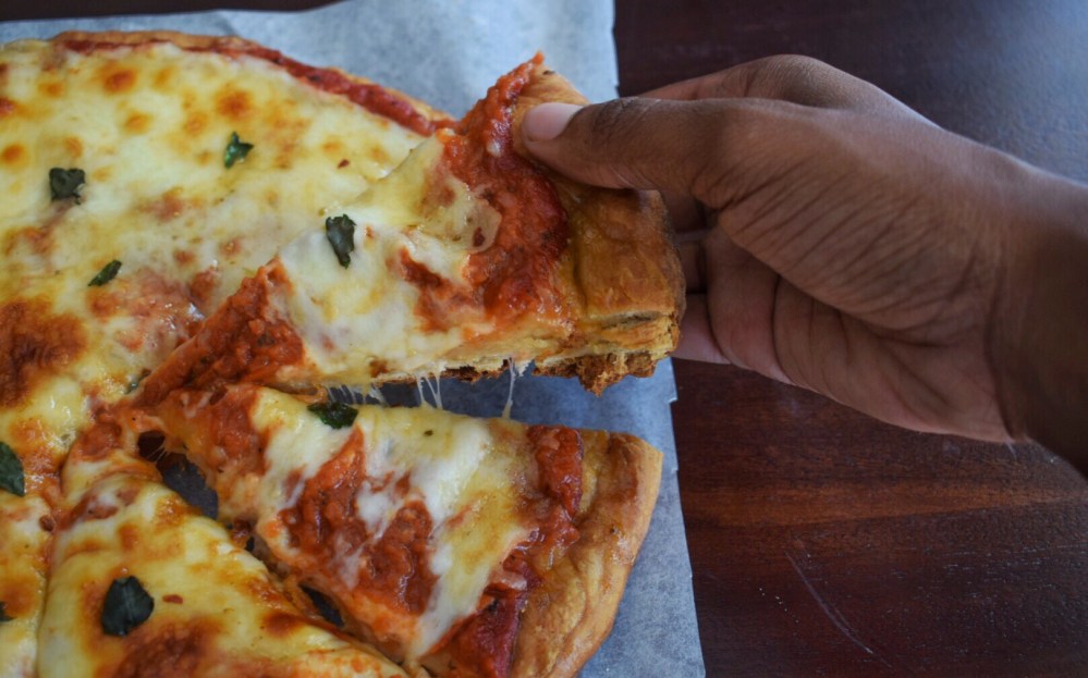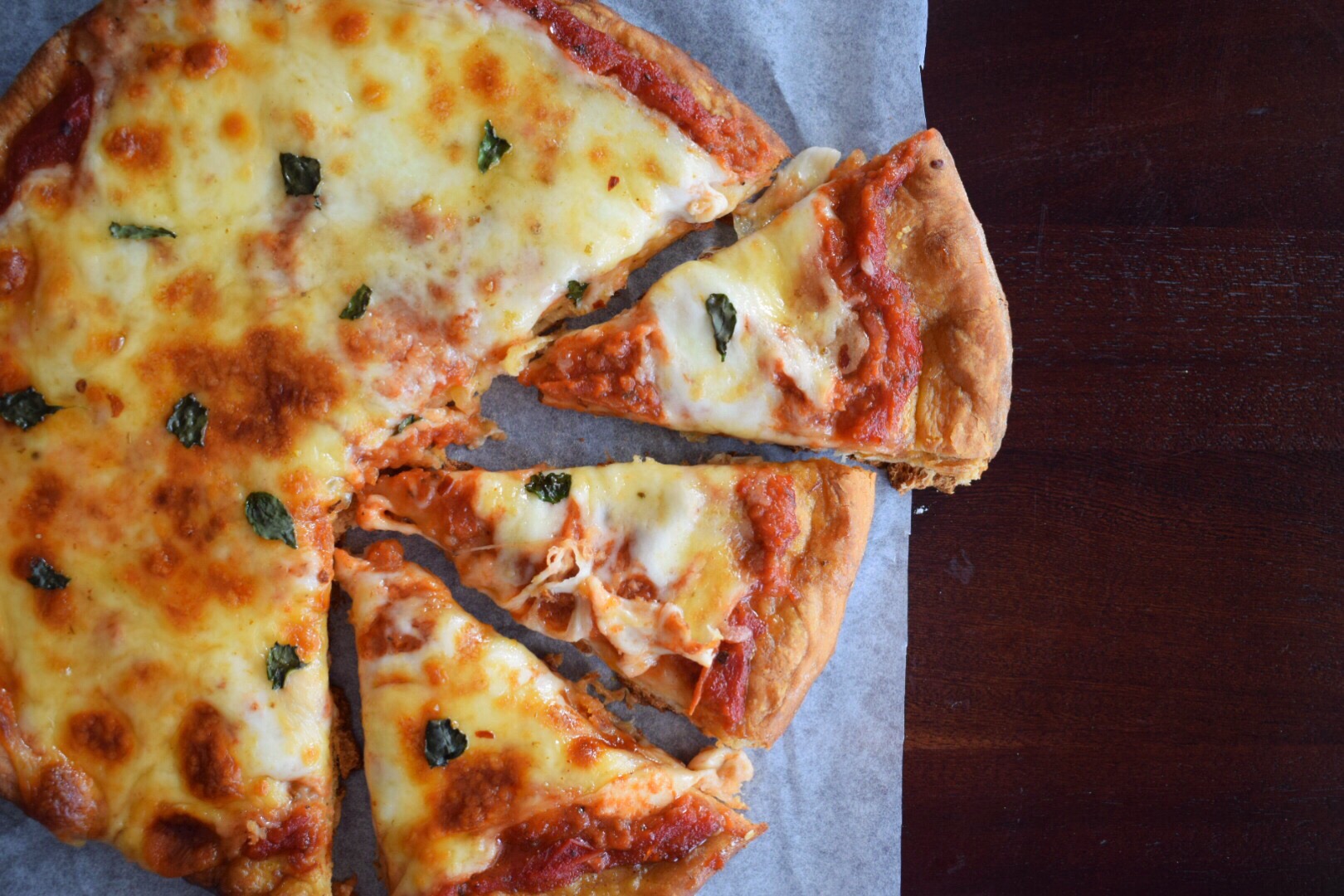 - Cook the pizza dough until it starts to form large bubbles, about 3-4 minutes. Switch off the stove before drizzling olive oil over the surface of the dough and seasoning with salt and pepper. Spread the marinara sauce evenly over the surface of the dough. It’s okay if you don’t have as much of a crust as you would like, the tomatoes will caramelise where the sauce is thin and you will end up with something so much better. Layer the cheese evenly over the tomato base before transferring to the oven to bake for 15-20 minutes or until the cheese is deep golden brown, and bubbling.
