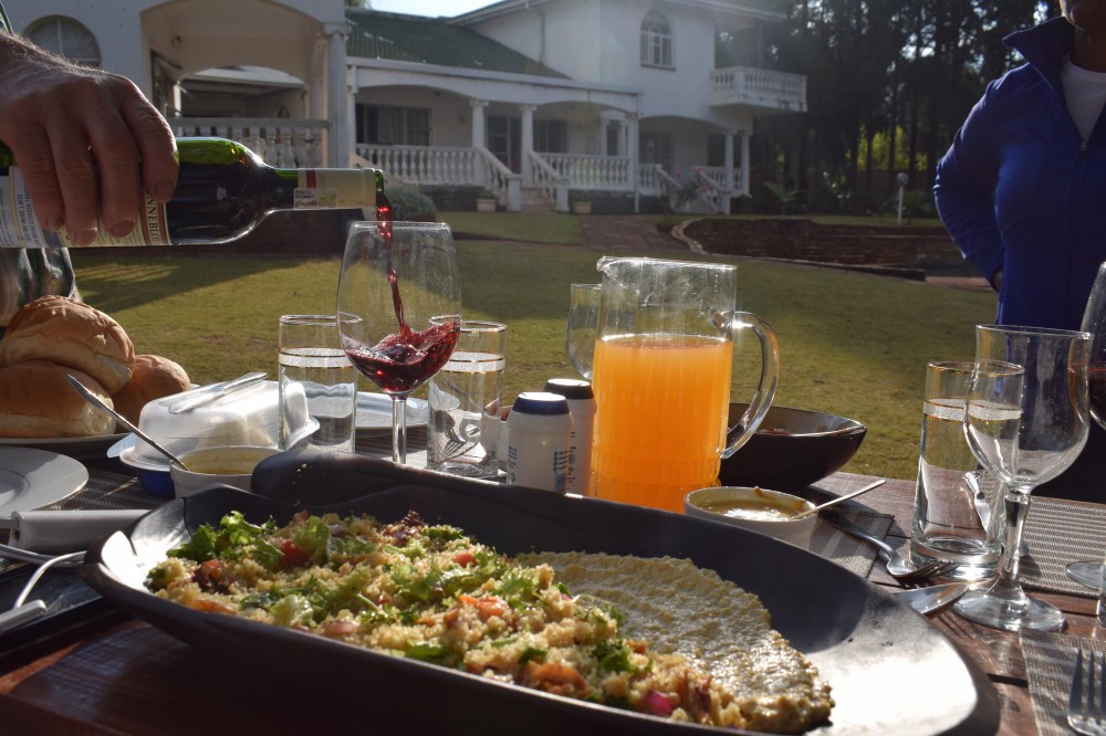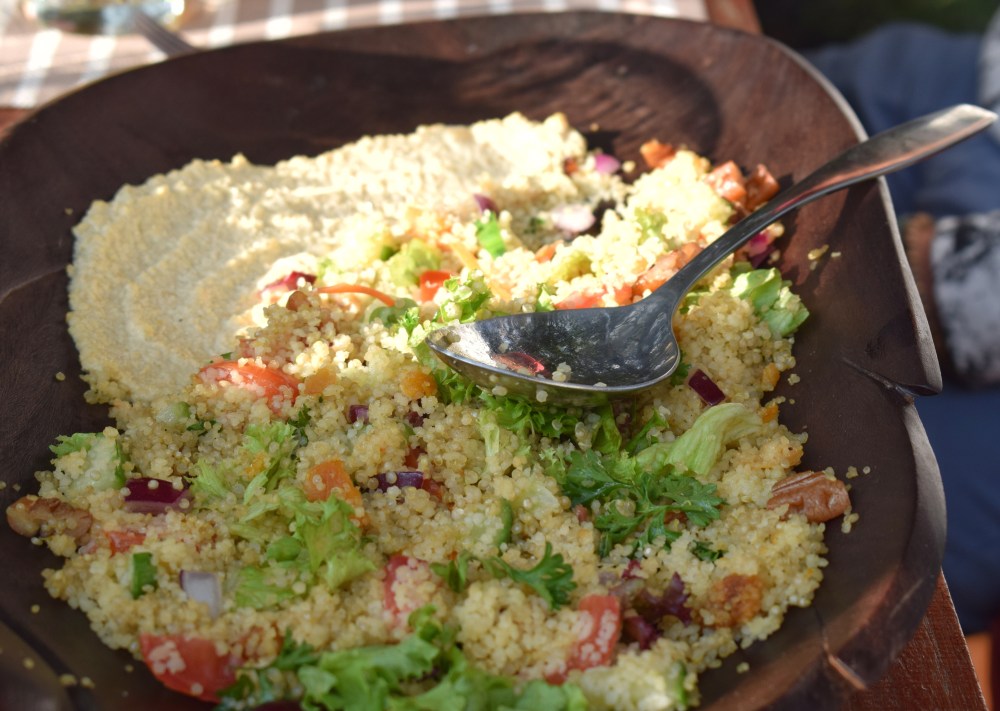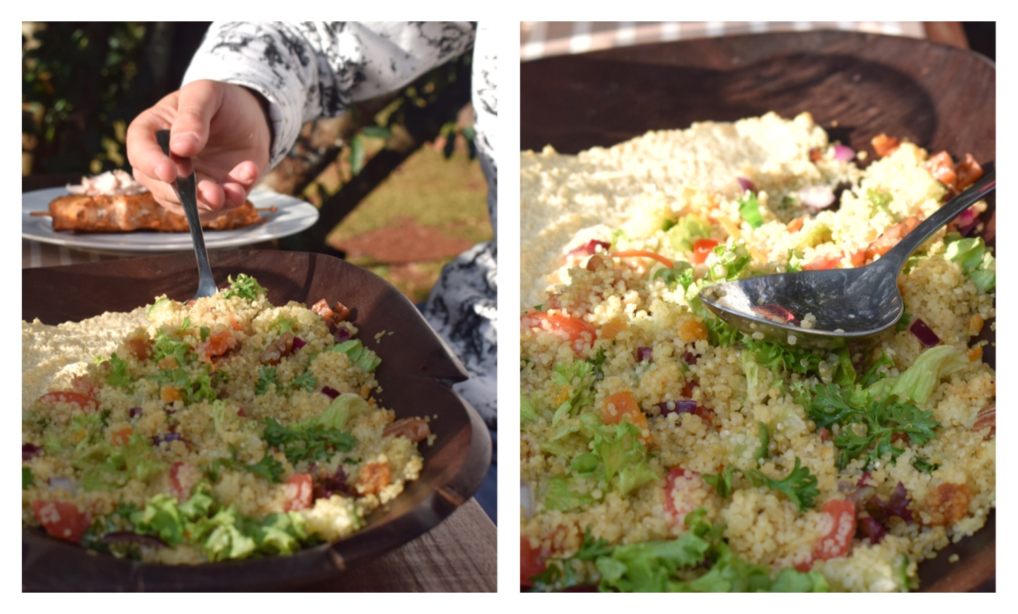 - Once the couscous is done and you’re happy with the texture, transfer it to a salad bowl or the dish you’re going to serve it in. Top with the tomato, cucumber, onion, fresh herbs, dried apricots, pecans and almonds. Use a salad spinner or 2 forks to toss the tabbouleh and evenly distribute the veggies.