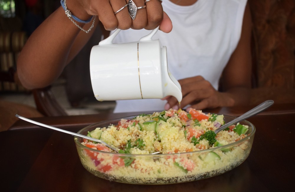 - Whilst the couscous is soaking, prepare the dressing. Add the olive oil, lemon juice and garlic to a small jug and allow to sit at room temperature. Taste the dressing to make sure you’re happy with it, if it’s too bitter then you can add a teaspoon of warm honey to improve the flavour, though I usually don’t find this necessary.