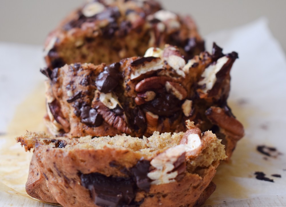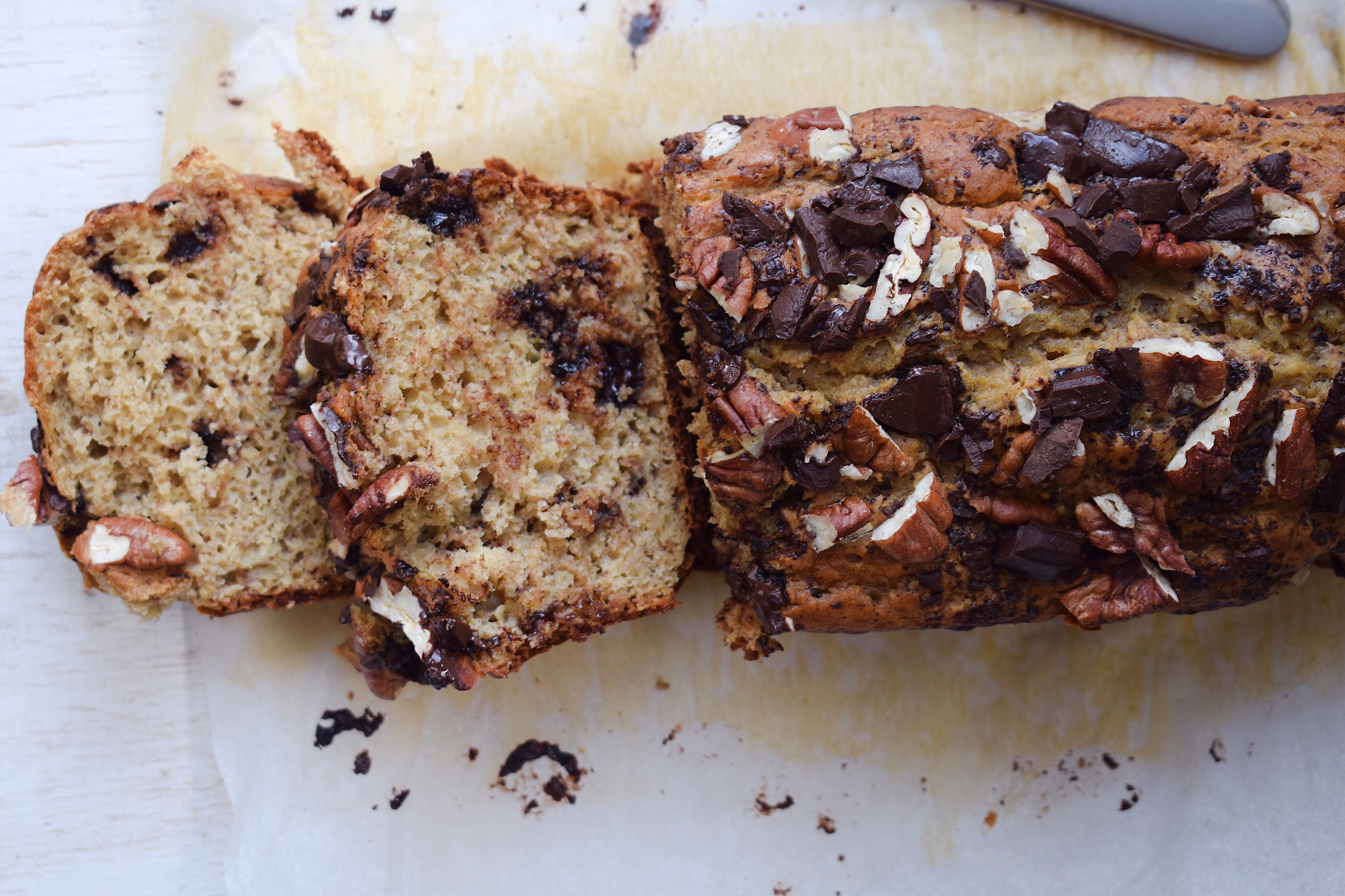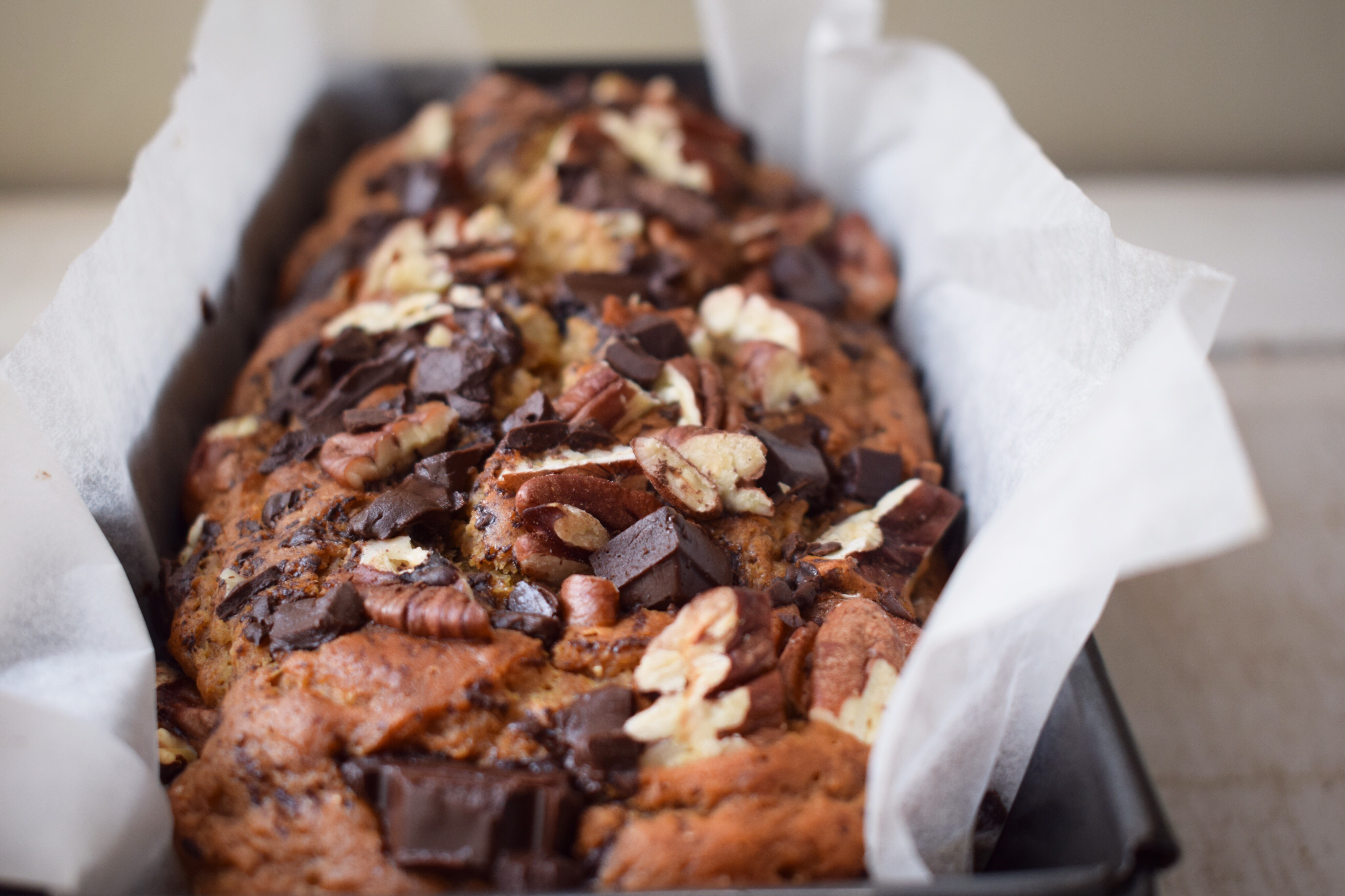The chocolate pecan topping on his bread is what makes it oh-so-delightful, staring at it just makes my mouth water! The bananas help make this bread incredibly moist whilst using maple syrup as a sweetener enhances the flavour as it pairs so well with the pecans. For extra flavour points, roast the pecans on the stove or in a hot oven for 10 minutes or until fragrant. That’s a one way ticket to bliss!