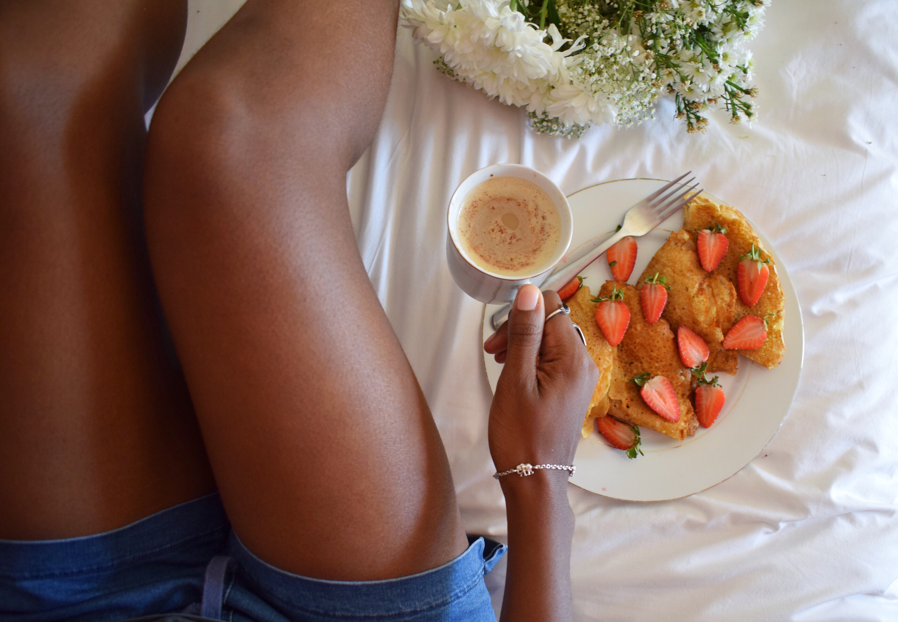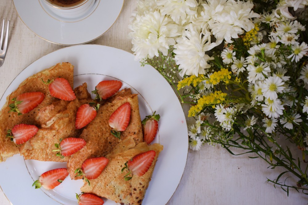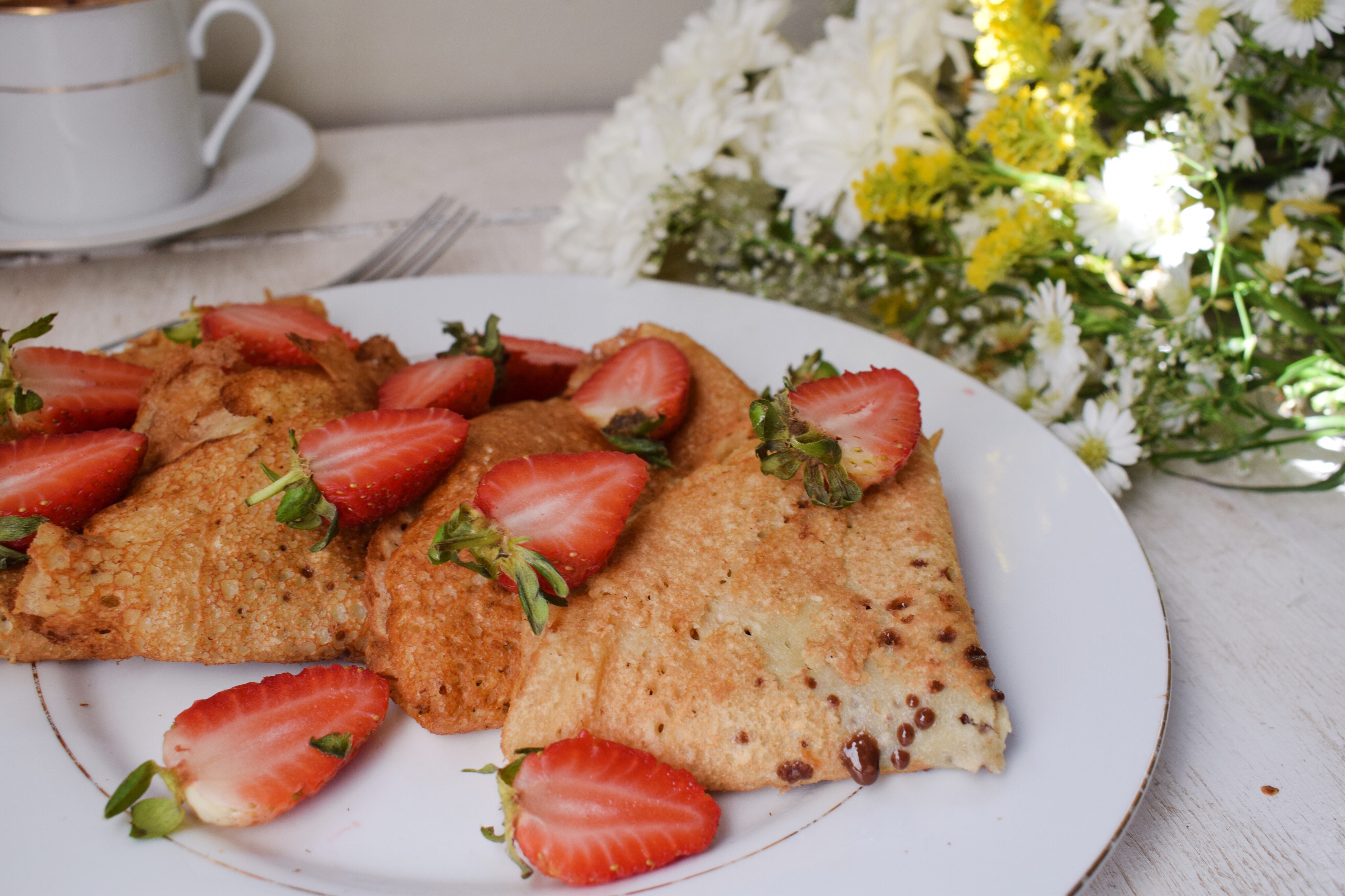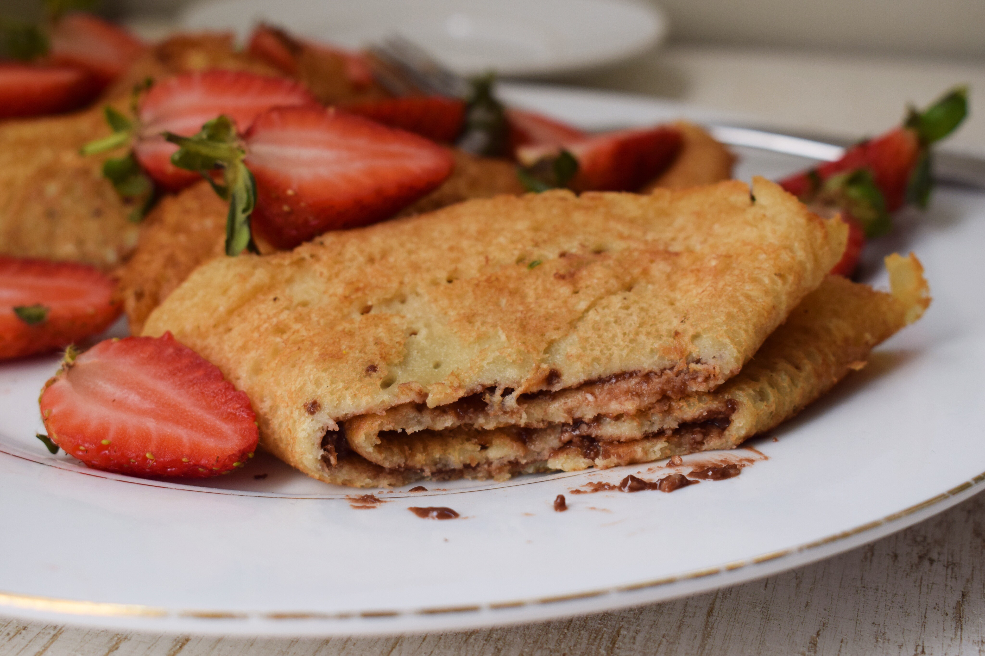 - Once you’ve cooked all the crepes, spread the lighter side of the crepes with some strawberry jam or chocolate spread. Fold the crepes into half and then into quarters before serving topped with the fresh strawberries. Enjoy!