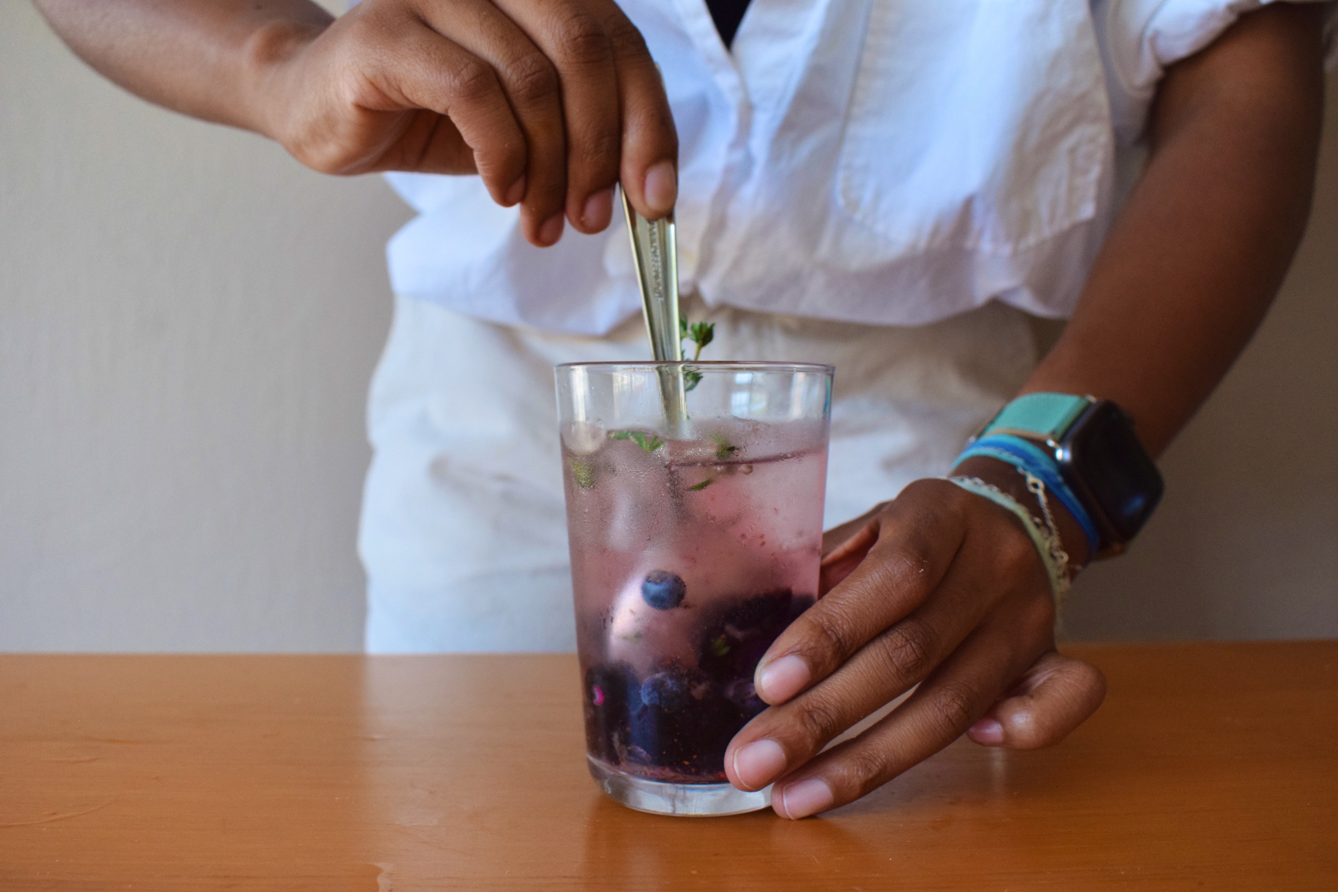 - Add the blueberries, sugar and thyme to a small bowl and muddle with a muddler (or a large spoon) to release the juices and allow the thyme flavour to be absorbed. Leave to sit for at least 10 minutes to allow the berries to macerate.