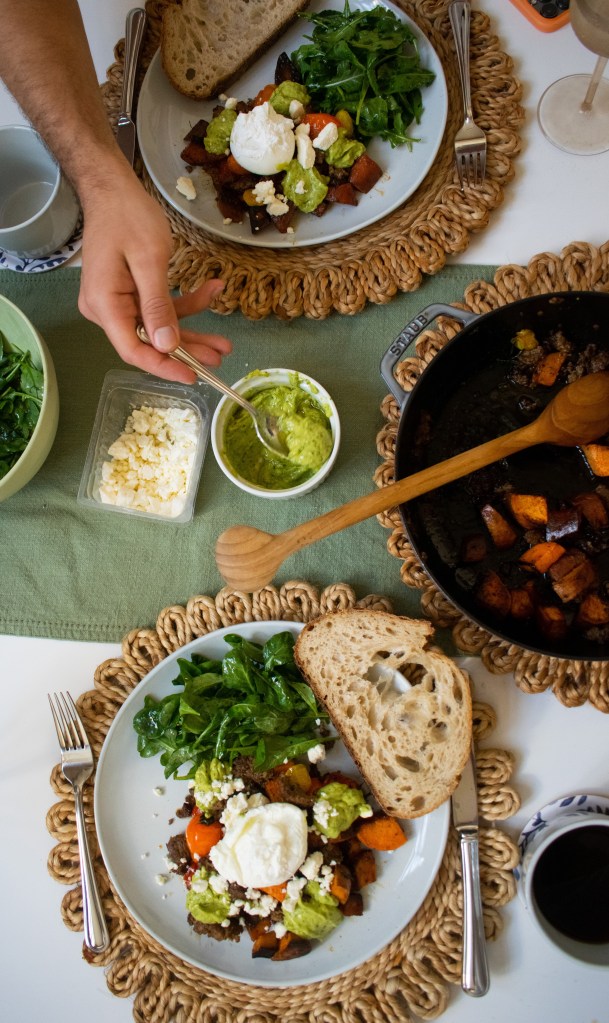 In addition to a lack of time, I’m also not inspired to cook breakfast during the week. Weekends, however, are a different story. Father Time on my side, I can adorn my breakfast table with the garnishes she deserves. Here we have warm lamb, sweet potatoes and cherry tomatoes topped with feta and garlicky green sauce with a side of rustic bread and arugula. What more could your brunch table want?