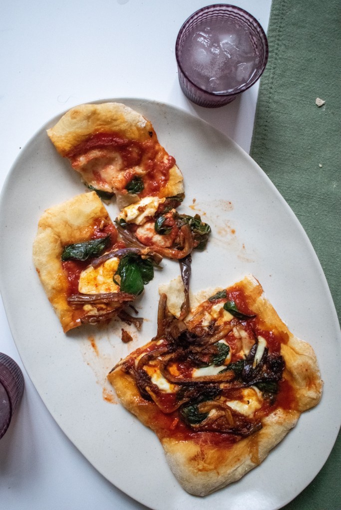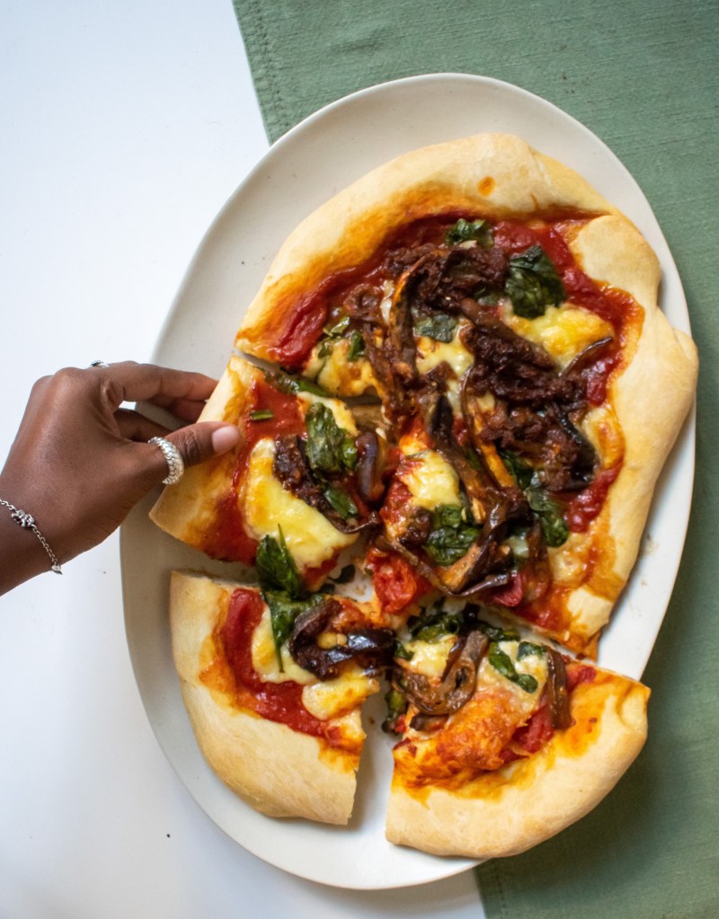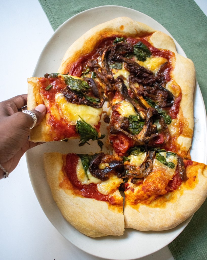 - Preheat your oven to 225C/450F and leave the pizza stone or baking sheet in the oven to heat up in the oven. Assemble the pizza! Roll out the pizza dough on parchment paper or aluminium foil to a ¾ inch/2cm thickness. Spread the crushed tomatoes or pizza sauce over the dough, leaving a ¾ inch/2cm thick border. Tear the mozzarella into pieces and layer over the sauce. Next layer the spinach salad and finally the eggplant. Bake until the crush is a golden brown, 20 – 25 minutes, watching carefully. Shake together the honey and kimchi in a glass jar and drizzle roughly 3 tbsp over the top of the pizza. Serve hot and drizzle any additional kimchi hot honey over the top. Enjoy!