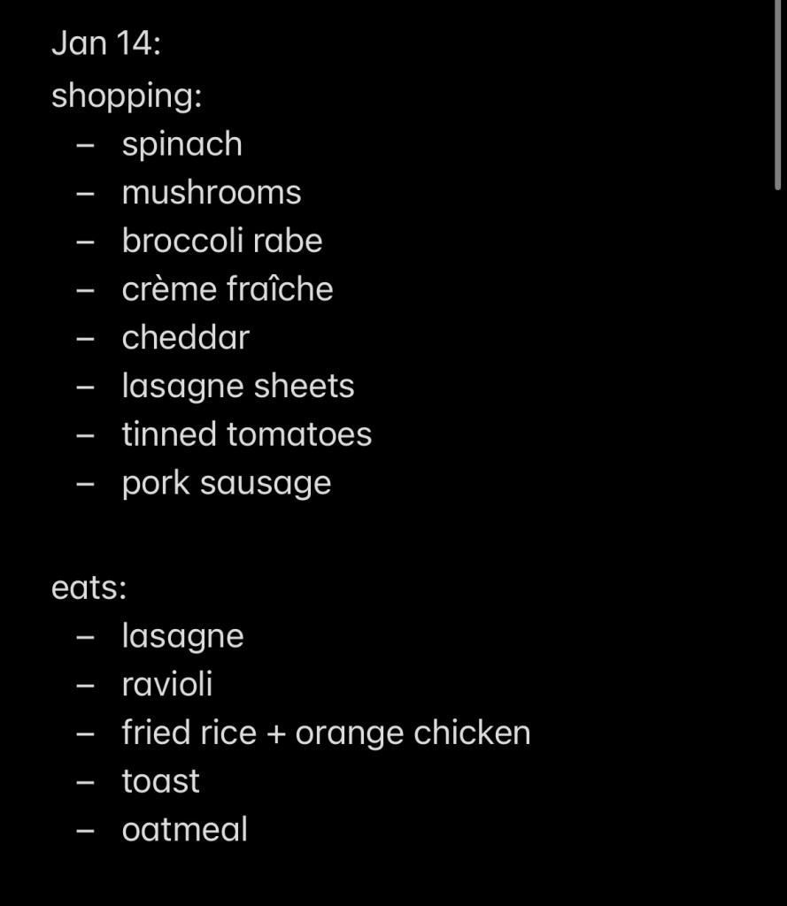 The workweek was (thankfully) cut short by Martin Luther King Jr day and this week’s menu was cut short by work lunches and social outings, meaning I only had to prepare 6 meals this week. The theme of this week’s menu is shortcuts: made clear by the proliferation of frozen food in the grocery list below. An Arctic chill swept across the East Coast last week, dropping temperatures as far down as -8C, with the wind lowering the “real feel” to -13C. Whilst this may have inspired me to take refuge in my tiny New York studio apartment, my rattling radiator’s reach does not extend as far as rhetoric kitchen, making it the coldest corner of my apartment. Aiming to spend as little time slaving over a hot stove in a cold kitchen, fresh lasagne sheets, and Trader Joe’s chicken and rice all found their way into this week’s list.