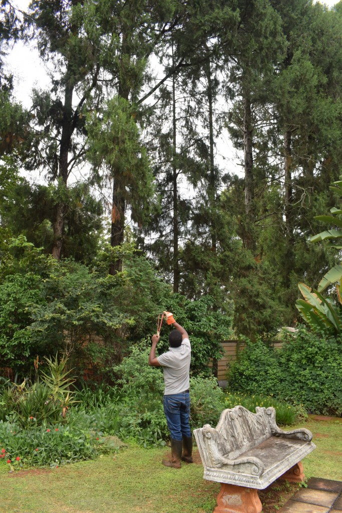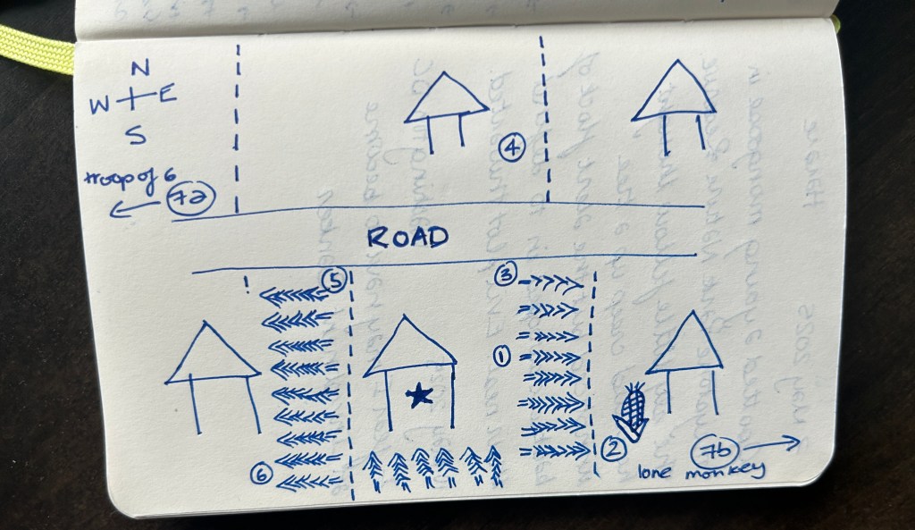Ever the enemies of their own progress, the guttural voices cry out as another fight erupts between 2 males. They dash from tree to tree, taking swipes at each other and both crash onto the ground on our side of the wall. One scampers up the tree, attempting to escape to our eastern neighbour, his opponent on his tail. They clash in an avocado tree and we watch helplessly from below as branches crash to the ground, indicating just how intense this battle is. Always an opportunist, my dad launches a pebble at the monkeys, hoping they’ll switch from attacking to retreating. The fight culminates with one monkey being thrown to the ground and it quickly withdraws west to the cypress trees where we first spotted them. The victor heads east, rejoining the troop in our neighbour’s leopard trees. My dad dashes in pursuit of the loser, the worst thing would be for this monkey to roost in our yard. It vaults itself quickly over the western wall and books it all the way across the maize field, far out of sight and reach. The monkey is sure not to return I comment, ‘It’s being pursued by 2 different people’. My dad adds ‘2 different motives but 1 common goal: nobody wants it around’.