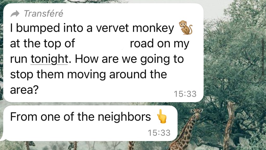 It’s just before 4pm, the sky so dark with heavy cloud cover that the garden lights illuminate as electricity returns. Eager to rejoin my internet friends who have surely missed me, I check my phone as a string of notifications pours in. My dad reminds me that the job’s not finished: we have to make sure the rest of the troop also moves on. We climb back up to the second floor balcony just to see the monkeys dashing through the leopard trees, being hotly pursued by the 2 primary school aged boys next door who are hooting and hollering at the primates making screeches indistinguishable from their own. Their methods seemingly more effective than ours, we count six monkeys descending back onto the road at top speed, making their way further west up the street. Challenge accepted, the boys eagerly mount their bikes and beg their mum to let them chase the monkeys down. Shot down, the boys retire as the monkeys continue their search for a roost. One thing’s for sure: it won’t be anywhere close to us.