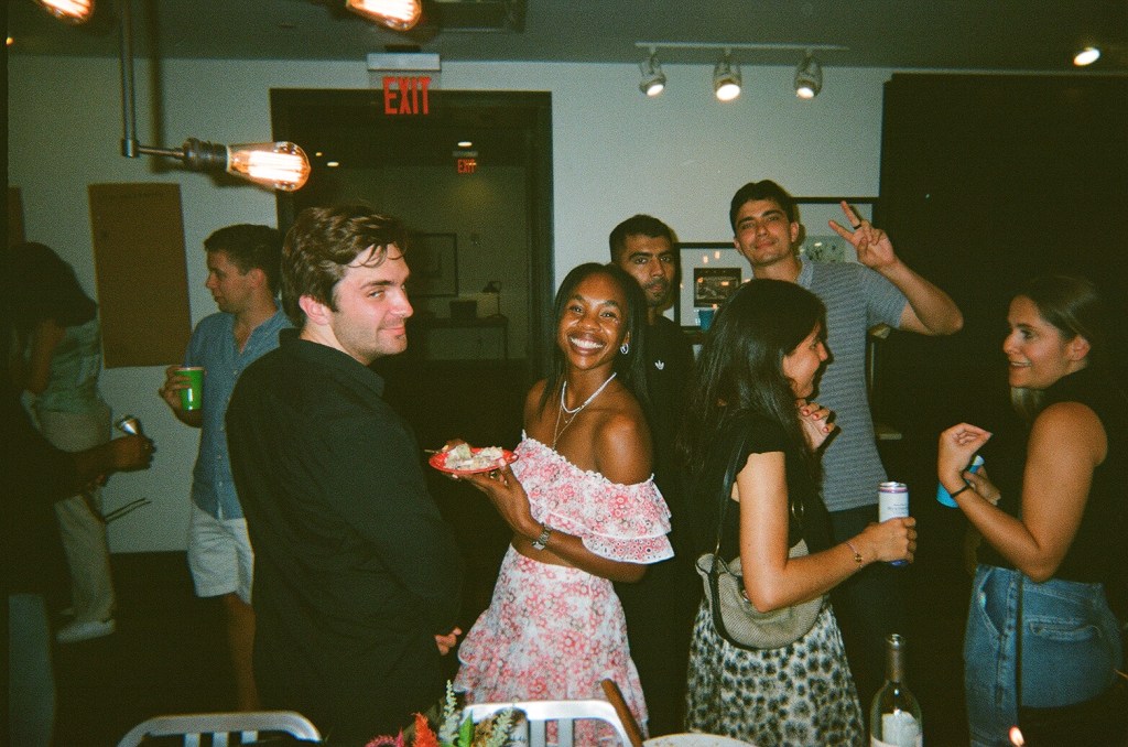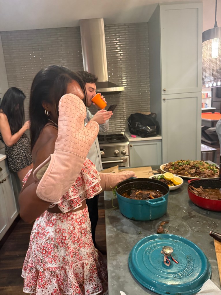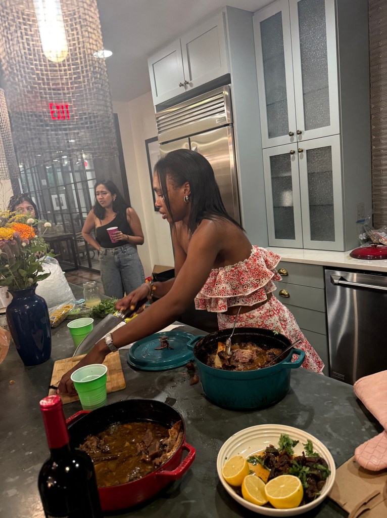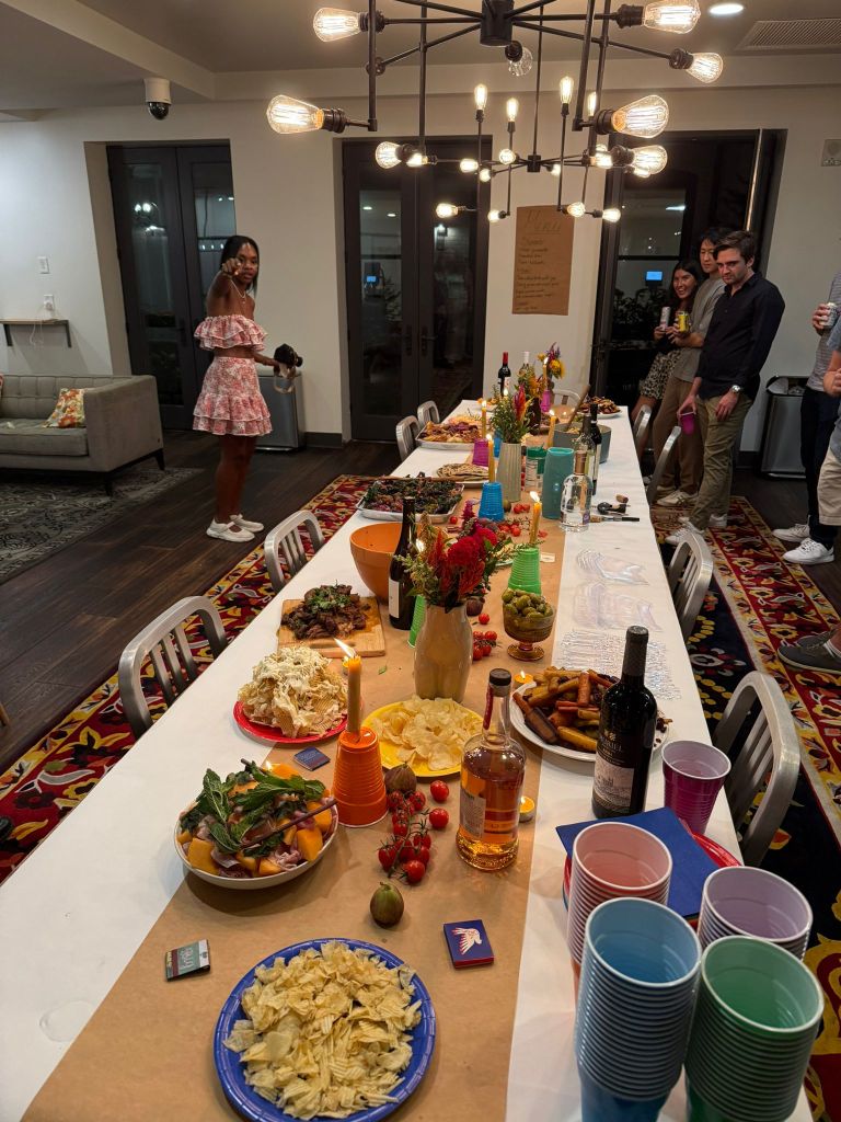 The menu set, the food not only had to be delicious but it also had to look appetising on the table. I’m a firm believer in curating experiences around the table – people won’t notice delays in serving or mismatched flavours if they’re entertained. Eclectic maximalism has been my style mantra since arriving at Wharton in May and I injected every ounce of colour and flair into designing this table. Butcher paper lined the table for easy cleanup (I’m a college student, I don’t own a tablecloth), rainbow plates and napkins for serving, and the highlights were my creative friends arranging lively bouquets and repurposing the rainbow Solo cups as candle holders.