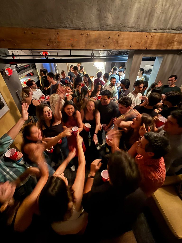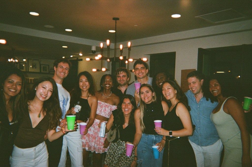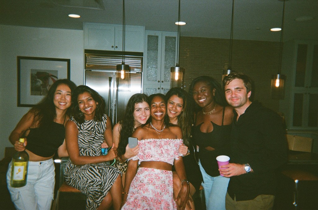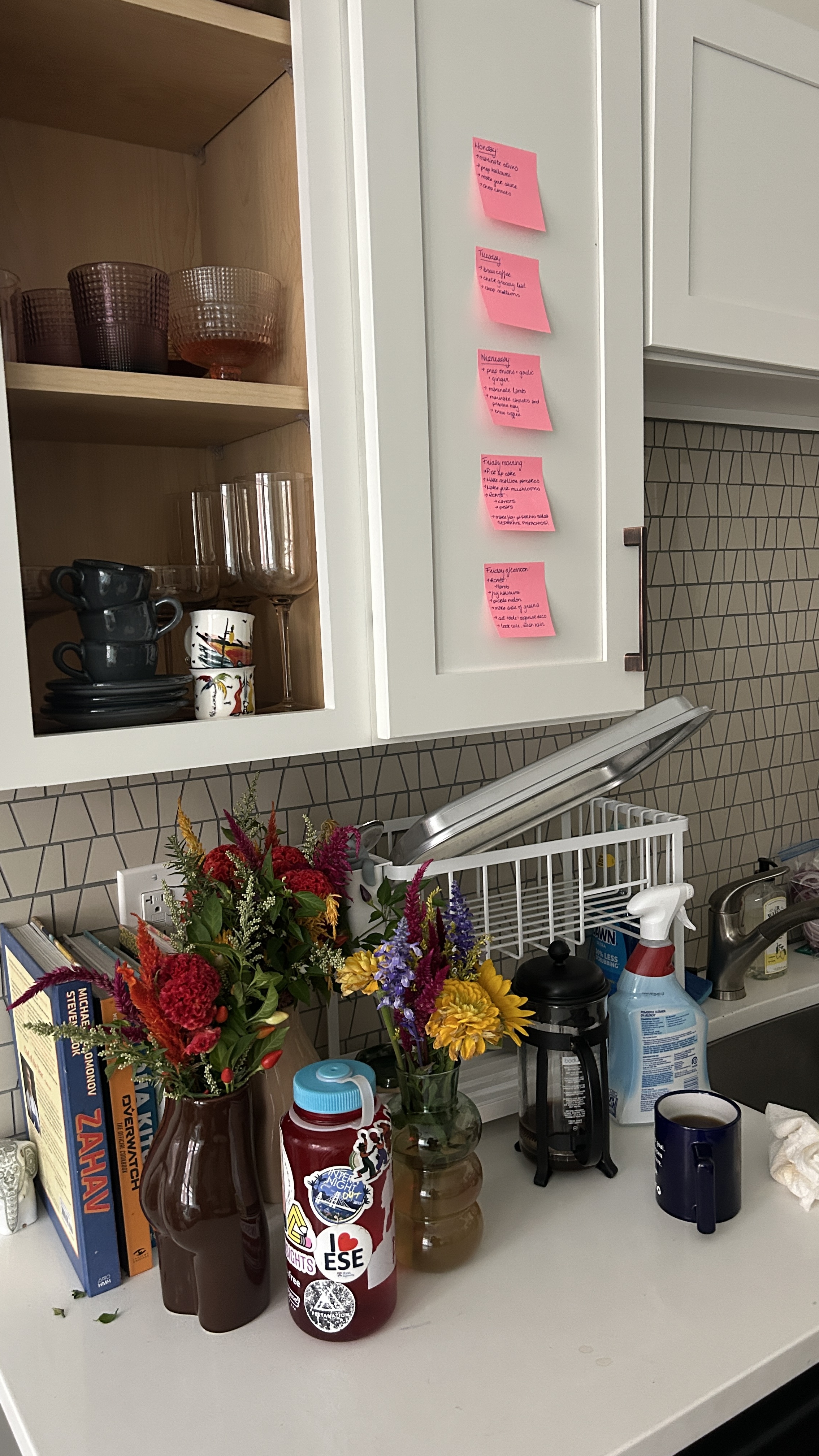 The menu set, the food not only had to be delicious but it also had to look appetising on the table. I’m a firm believer in curating experiences around the table – people won’t notice delays in serving or mismatched flavours if they’re entertained. Eclectic maximalism has been my style mantra since arriving at Wharton in May and I injected every ounce of colour and flair into designing this table. Butcher paper lined the table for easy cleanup (I’m a college student, I don’t own a tablecloth), rainbow plates and napkins for serving, and the highlights were my creative friends arranging lively bouquets and repurposing the rainbow Solo cups as candle holders.